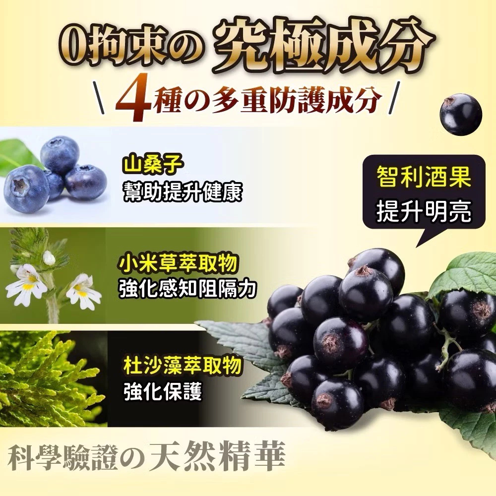 • 山桑子萃取100mg × 智利酒果萃取100mg,搭配小米草與杜沙藻萃取物,4種天然植萃複方