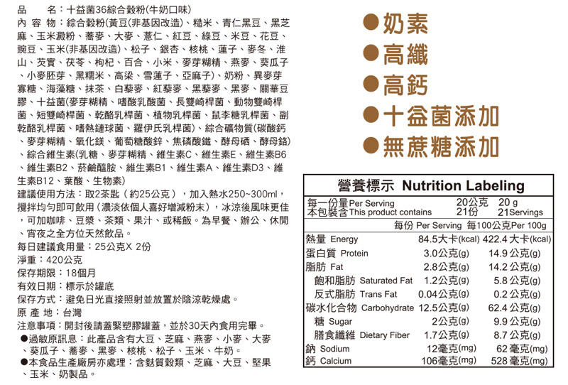 *奶素、高纖、高鈣、十益菌添加、無蔗糖添加!