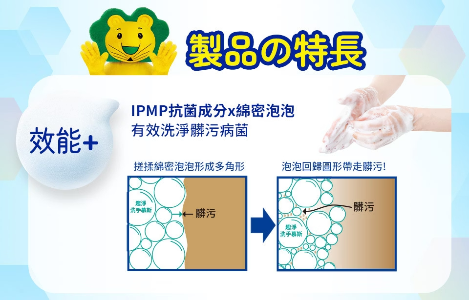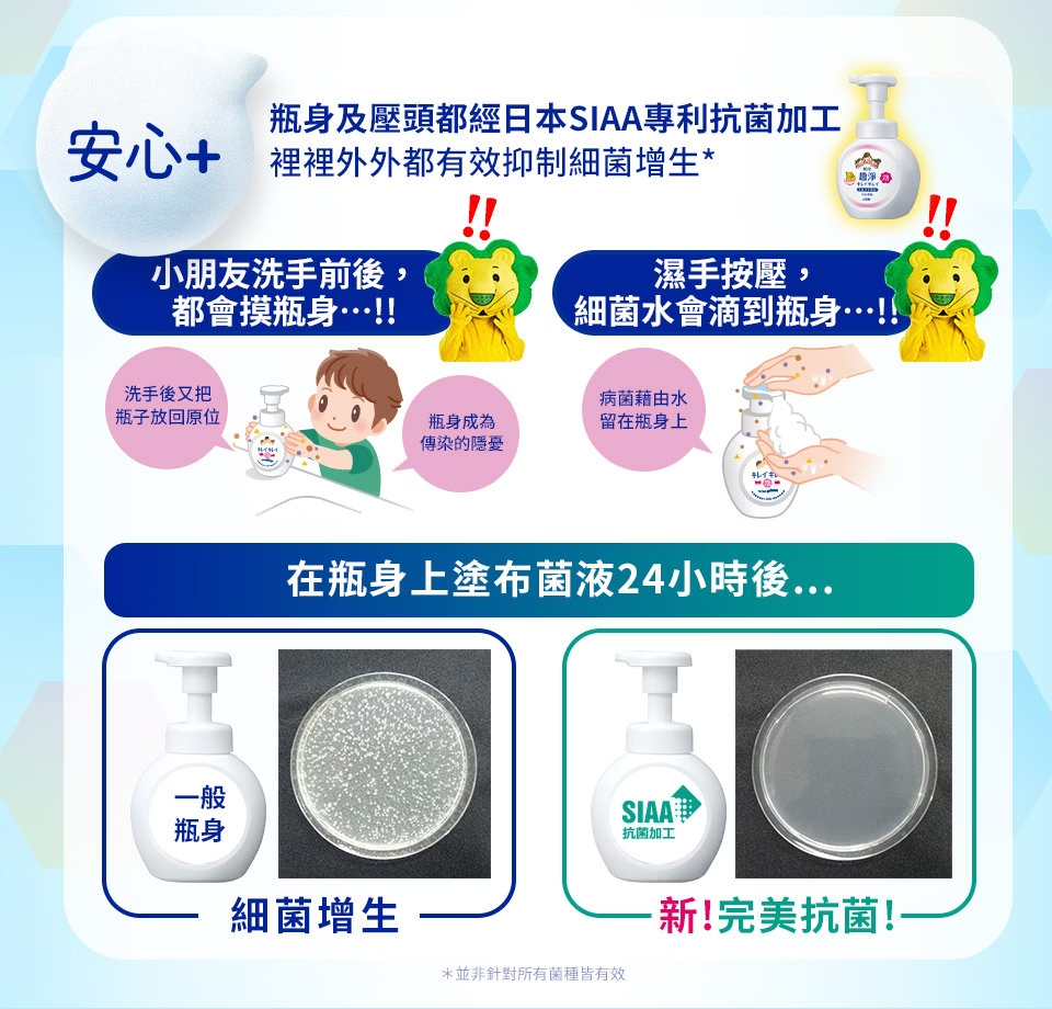・獨特壓頭: 可壓出超扎實濃密泡泡,且為通過日本SIAA認證的抗菌壓頭,可降低細菌滋生率。