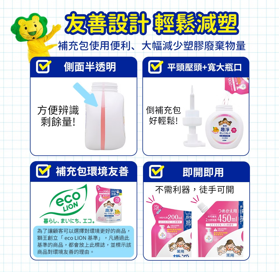 【日本獅王 LION】趣淨洗手慕斯|清爽柑橘/清新果香|250ml瓶裝/450ml補充包|日本原裝進口 抗菌潔淨 泡泡洗手乳