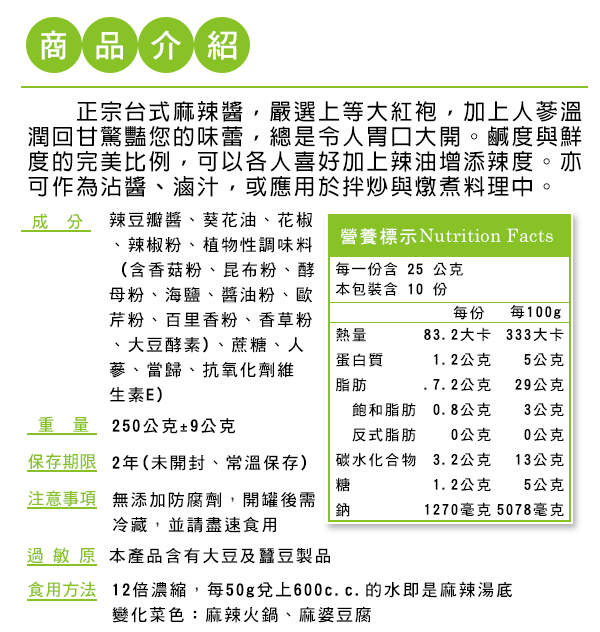 特選人蔘及當歸入醬,湯底口口回甘;一湯匙醬料搭配一盒豆腐及是麻婆豆腐。食用方式:12倍濃縮,每50g兌上600c.c.的水即是麻辣湯底。Dilute it 12 times with water for hotpot and Ramen soup.