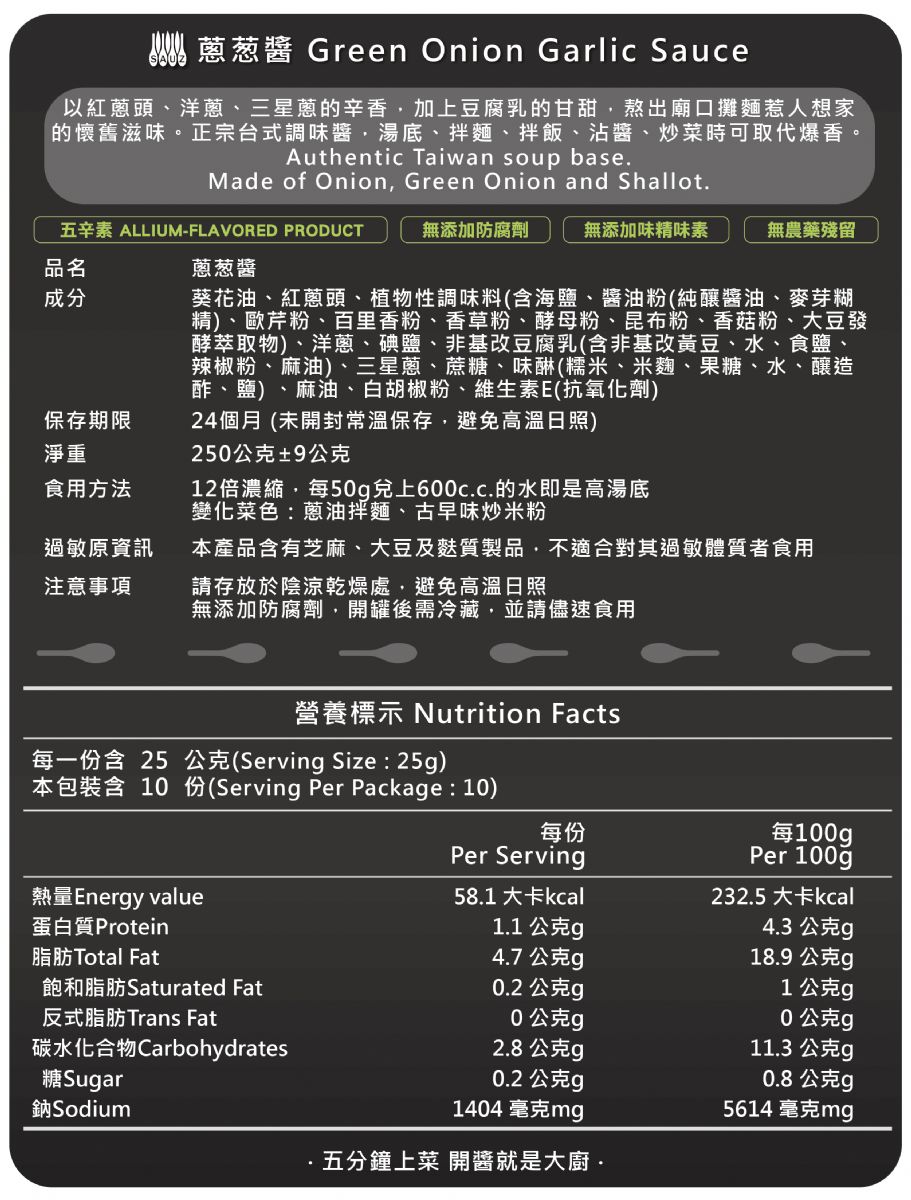 用宜蘭三星蔥、紅蔥頭、洋蔥,熬出正宗台式調味醬。食用方式:12倍濃縮,每50g兌上600c.c.的水即是高湯底。Authentic Taiwan soup base. Made of Onion, Green Onion and shallot.