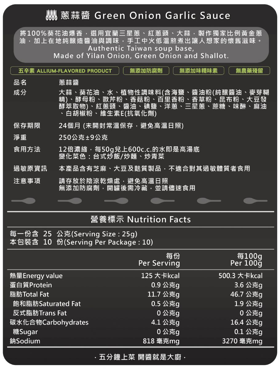 以自製黃金葱油爆香宜蘭三星蔥及大蒜,蒜香滿溢。食用方式:12倍濃縮,每50g兌上600c.c.的水即是高湯底。Taiwanese soup base. Made of Green Onion and Garlic.