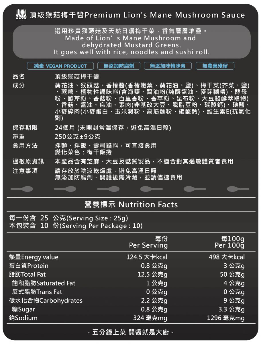 選用珍貴猴頭菇及天然日曬梅干菜,香氣層層堆疊。食用方式:拌麵、拌飯、壽司餡料,可直接食用。Made of Lion’s Mane Mushroom and dehydrated Mustard Greens. It goes well with rice, noodles and sushi roll.