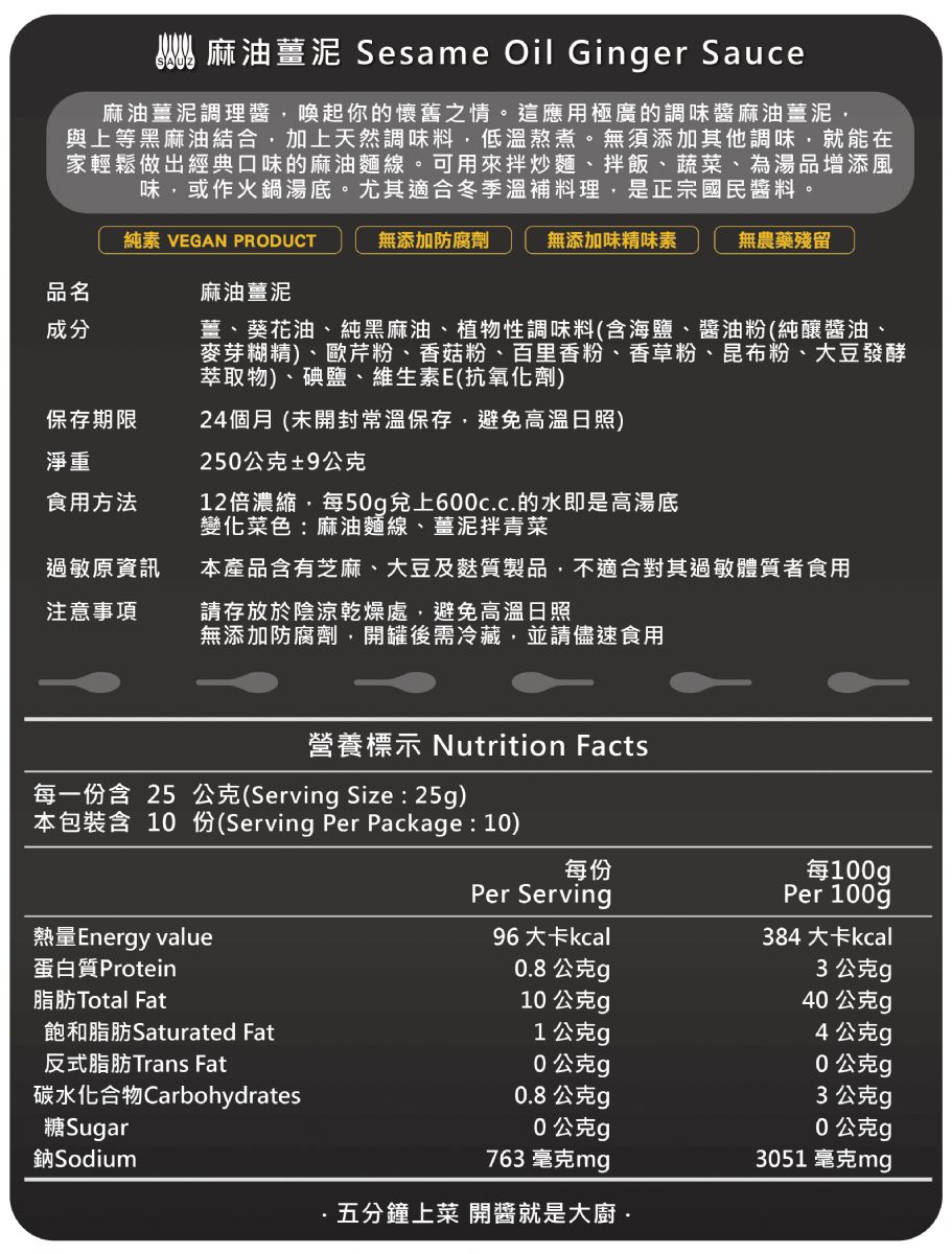 宜蘭契作老薑與上等純正黑麻油低溫炒製。食用方式:12倍濃縮,每50g兌上600c.c.的水即是高湯底。12 times concentrated. Made of grated old Ginger and Black Sesame oil. Serve with rice, noodles and vegetables.