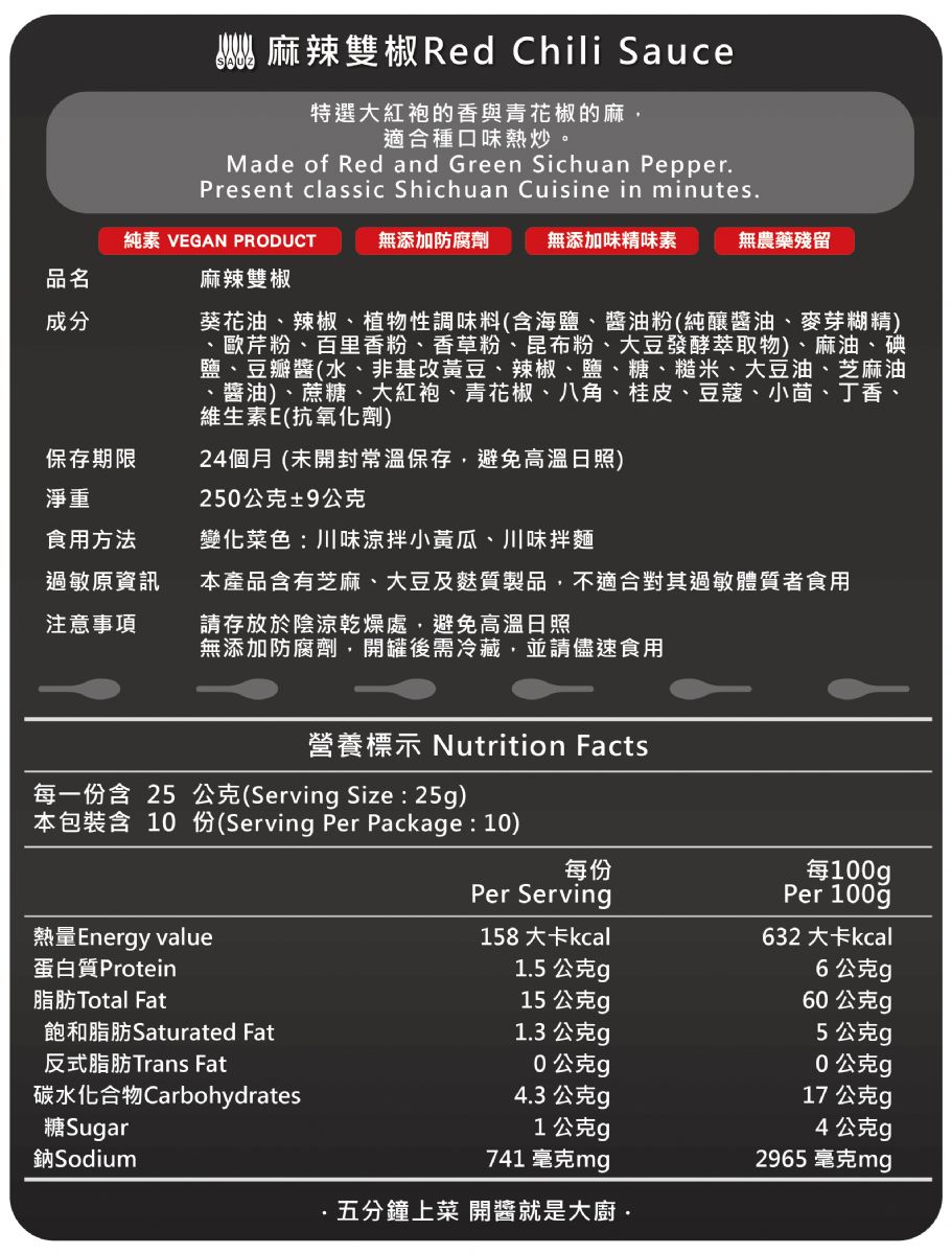 特選大紅袍的香與青花椒的麻,適合種口味熱炒。食用方式:直接當沾醬及拌醬。Made of Red and Green Sichuan Pepper. Present classic Shichuan Cuisine in minutes.