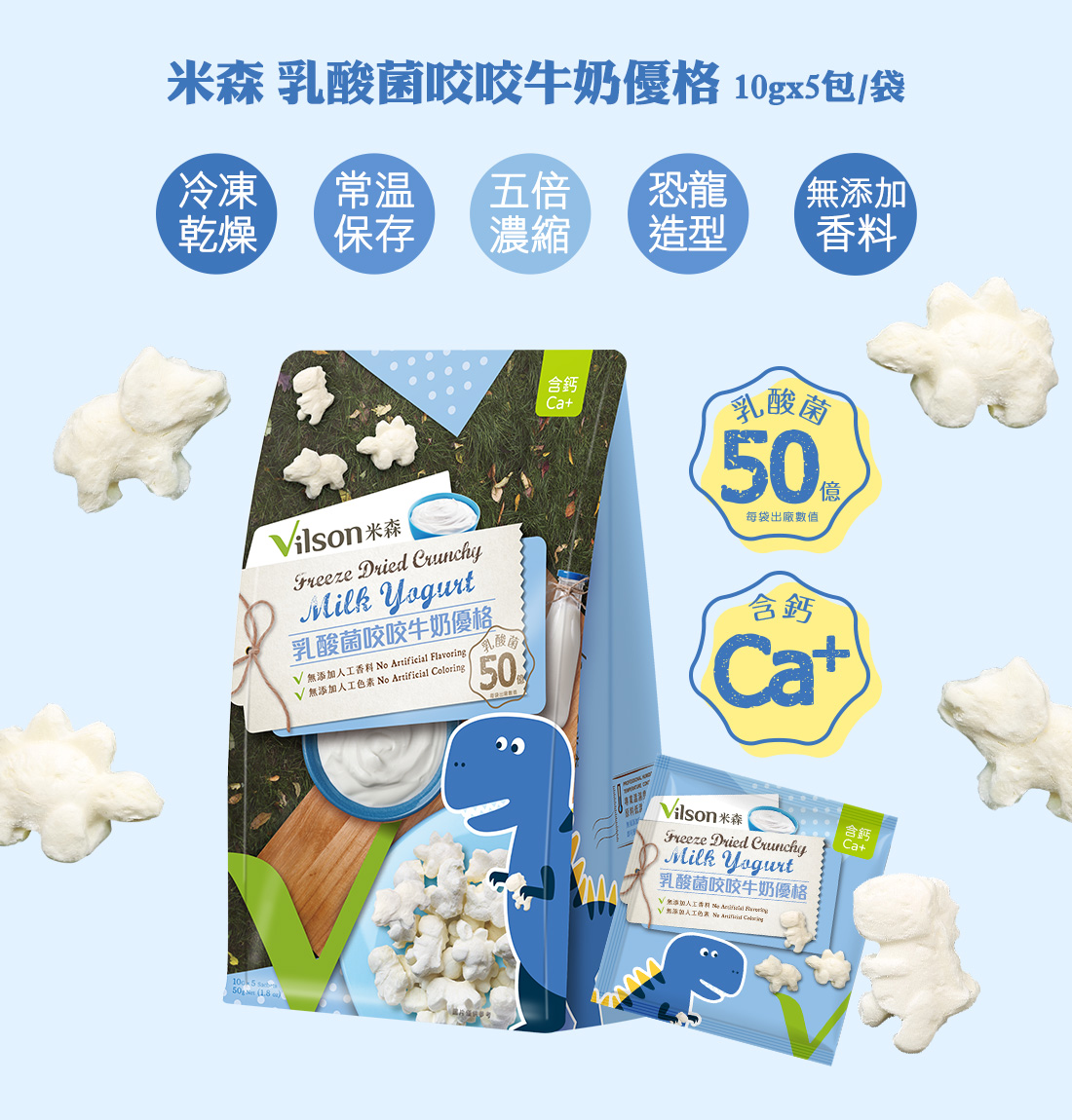 【米森 Vilson】乳酸菌咬咬牛奶優格 10gx5包|50億乳酸菌|5倍濃縮|高鈣固態優格零食|恐龍造型|無防腐劑無人工添加