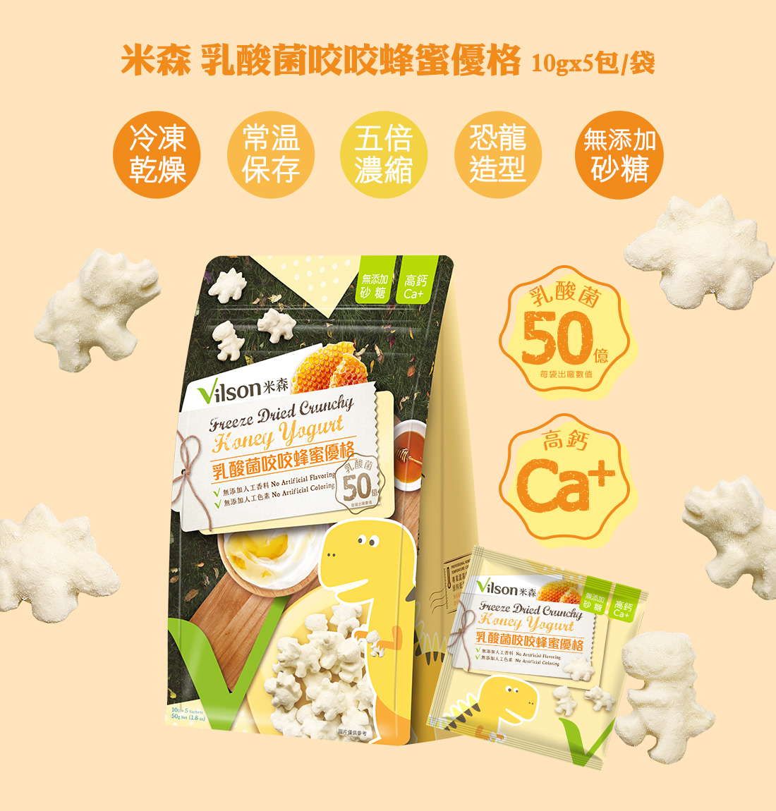 【米森 Vilson】乳酸菌咬咬蜂蜜優格 10gx5包|50億乳酸菌|龍眼蜜風味|5倍濃縮高鈣優格零食|恐龍造型|無人工添加