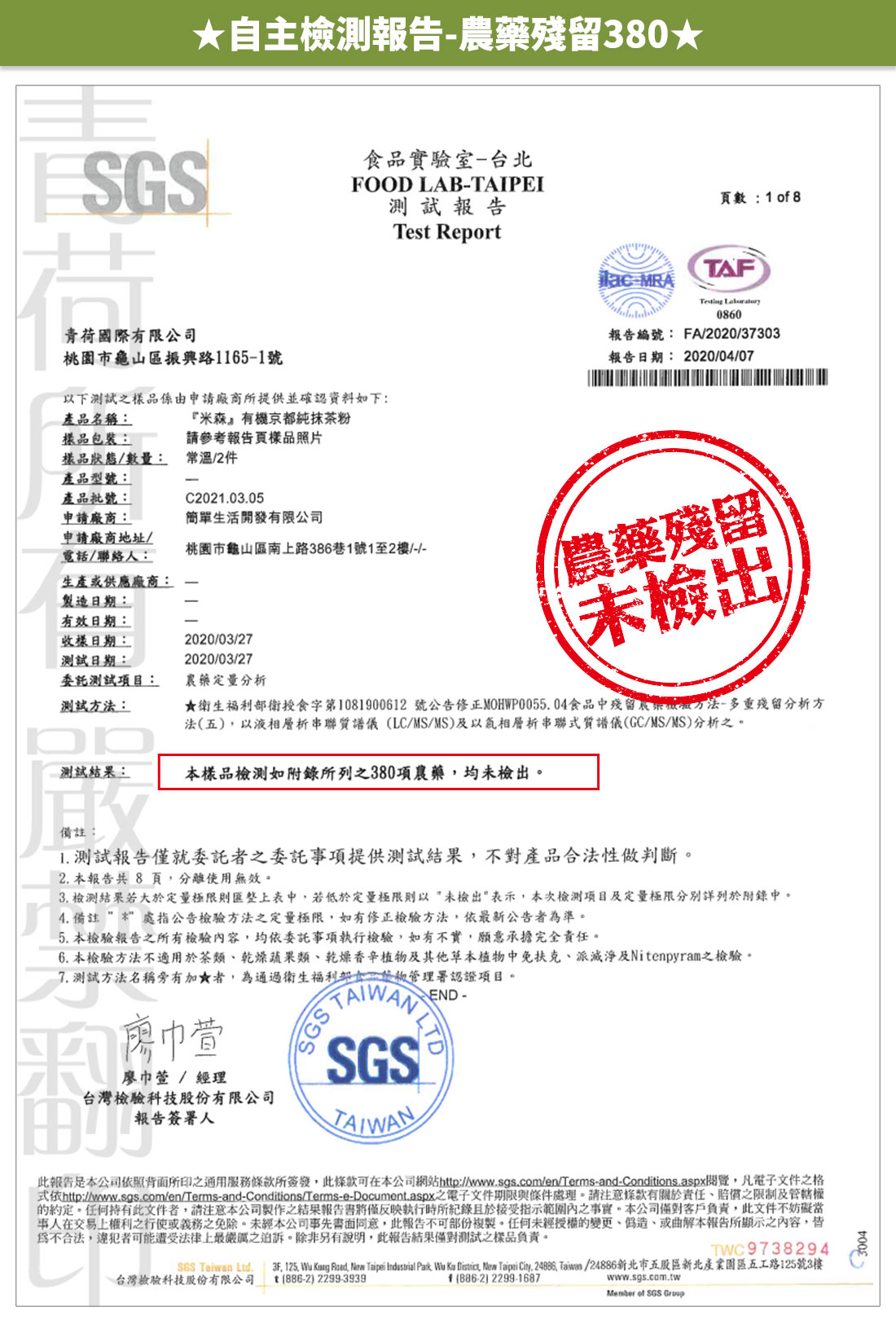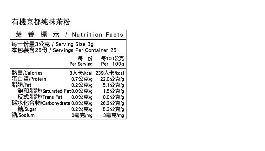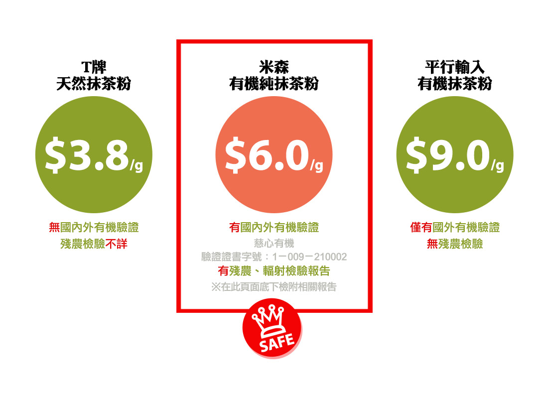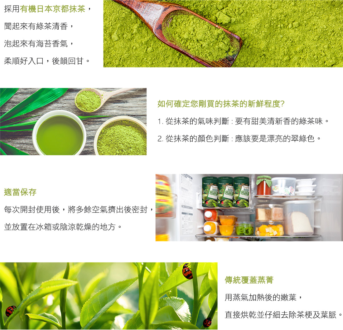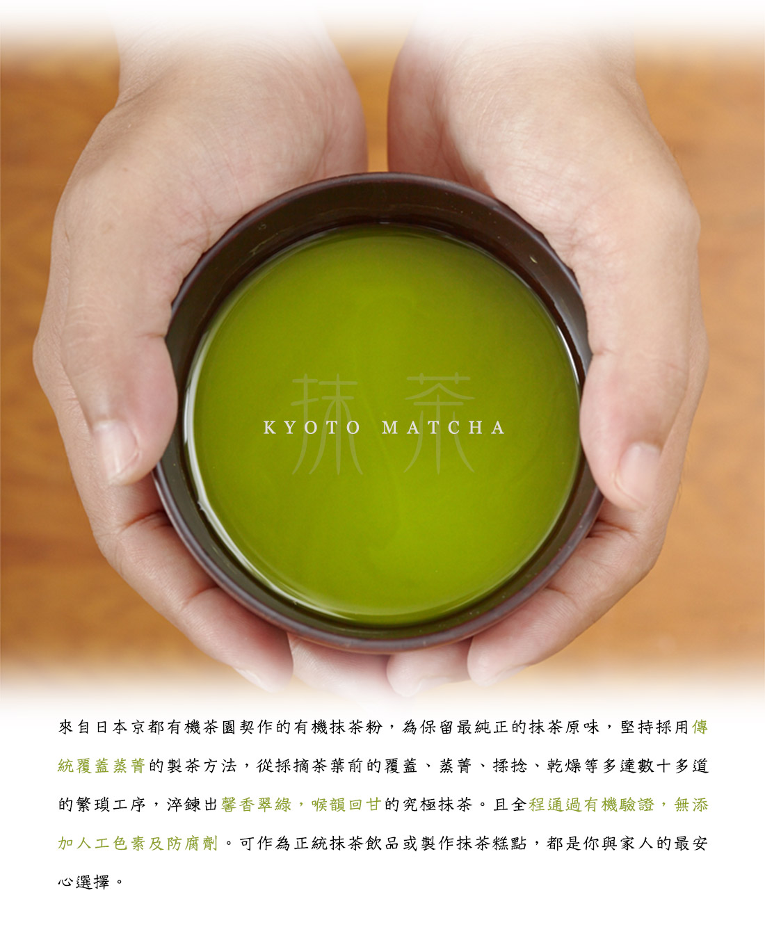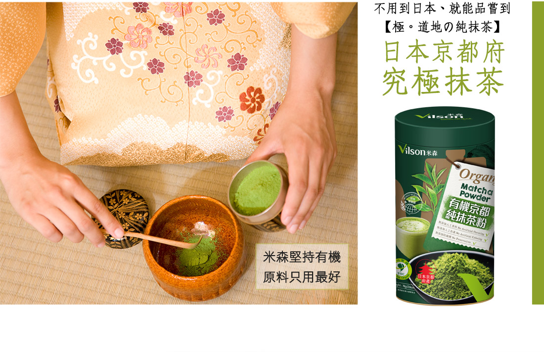 米森嚴選來自日本京都有機茶園契作的有機抹茶粉,為保留最純正的抹茶原味,堅持採用傳統覆蓋蒸菁的製茶方法,從採摘茶葉前的覆蓋、蒸菁、揉捻、乾燥等多達數十多道的繁瑣工序,淬鍊出馨香翠綠,喉韻回甘的究極抹茶。且全程通過有機驗證,無添加人工色素及防腐劑。可作為正統抹茶飲品或製作抹茶糕點,是全家人最安心選擇。