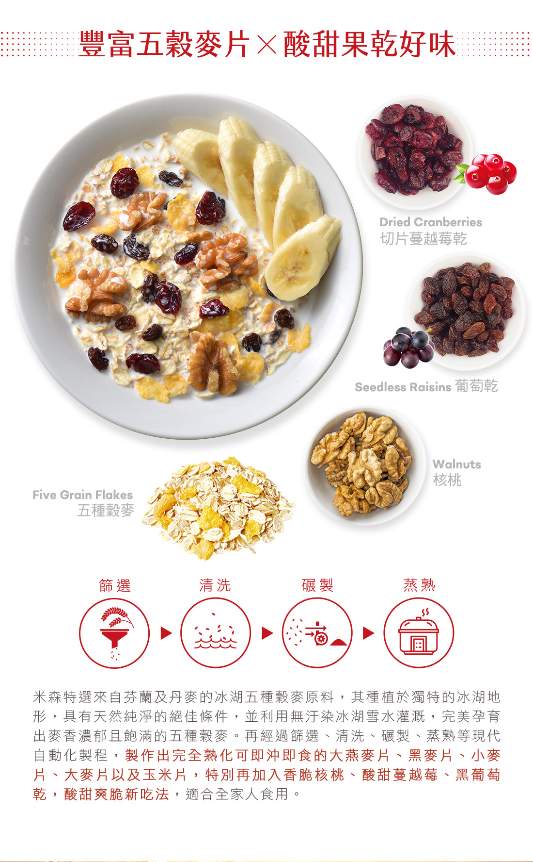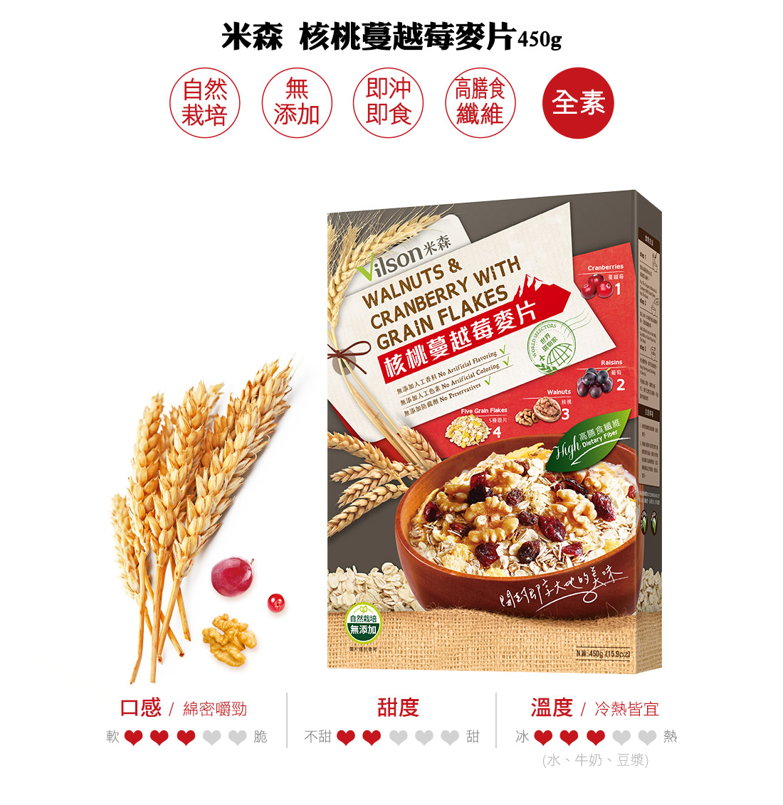 【米森 vilson】水果麥片系列 核桃蔓越莓麥片 450g 香脆核桃 酸甜蔓越莓 黑葡萄乾 果乾堅果 即沖即食 高纖營養