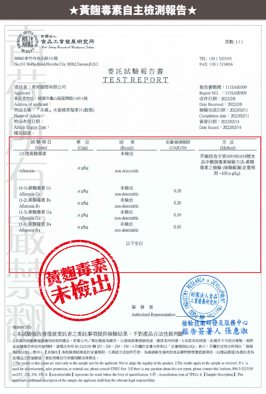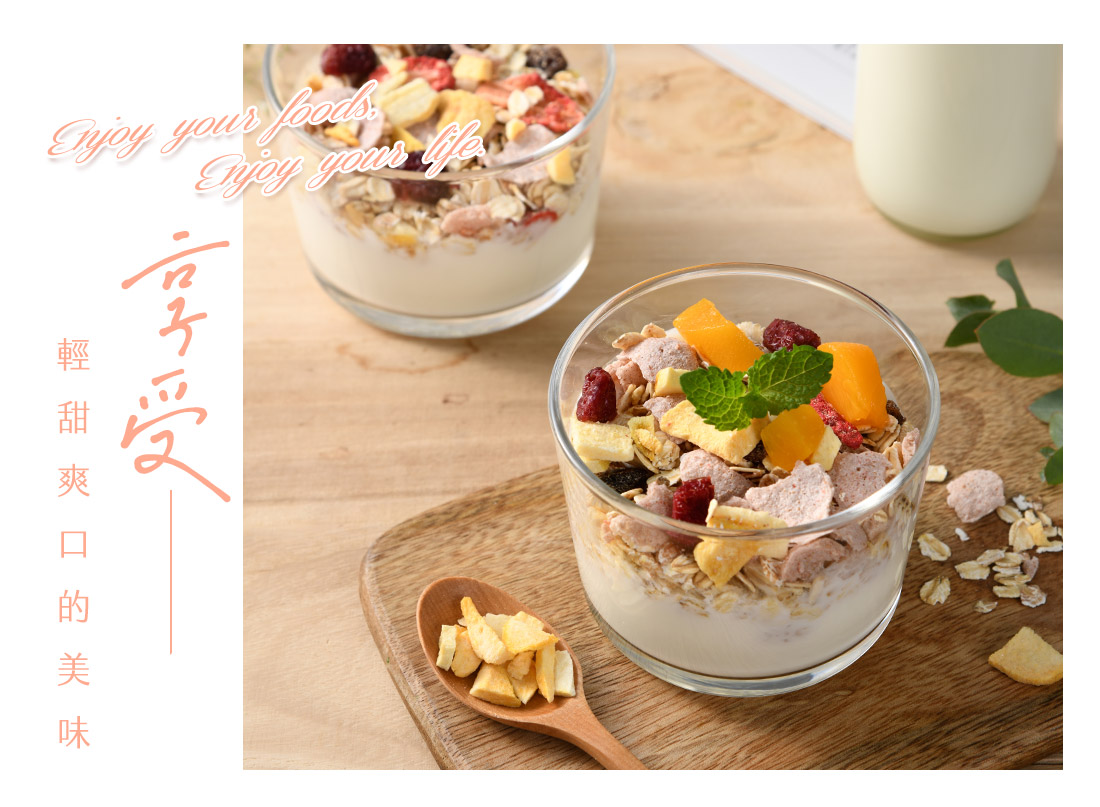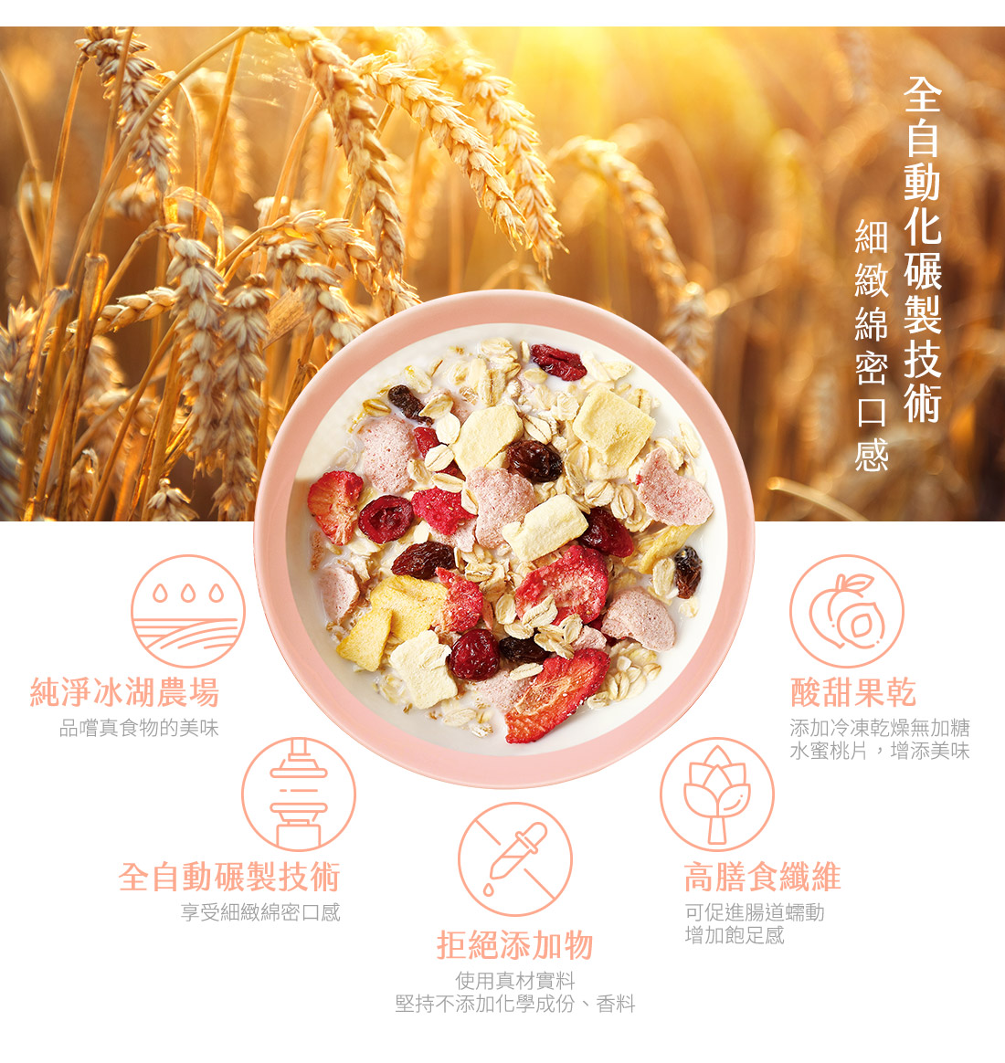 米森與國際大廠合作,採用超低溫冷凍乾燥技術,製作出7倍濃縮的水蜜桃片,鎖住水蜜桃完整營養,並與米森特選純淨冰湖的冰雪灌溉穀麥的麥片為基底、使用真草莓製作,堅持不油炸的香酥草莓穀脆片、酸甜可口的蔓越莓與葡萄,讓你品嚐到多層次口感,甜蜜滿足一口接一口。