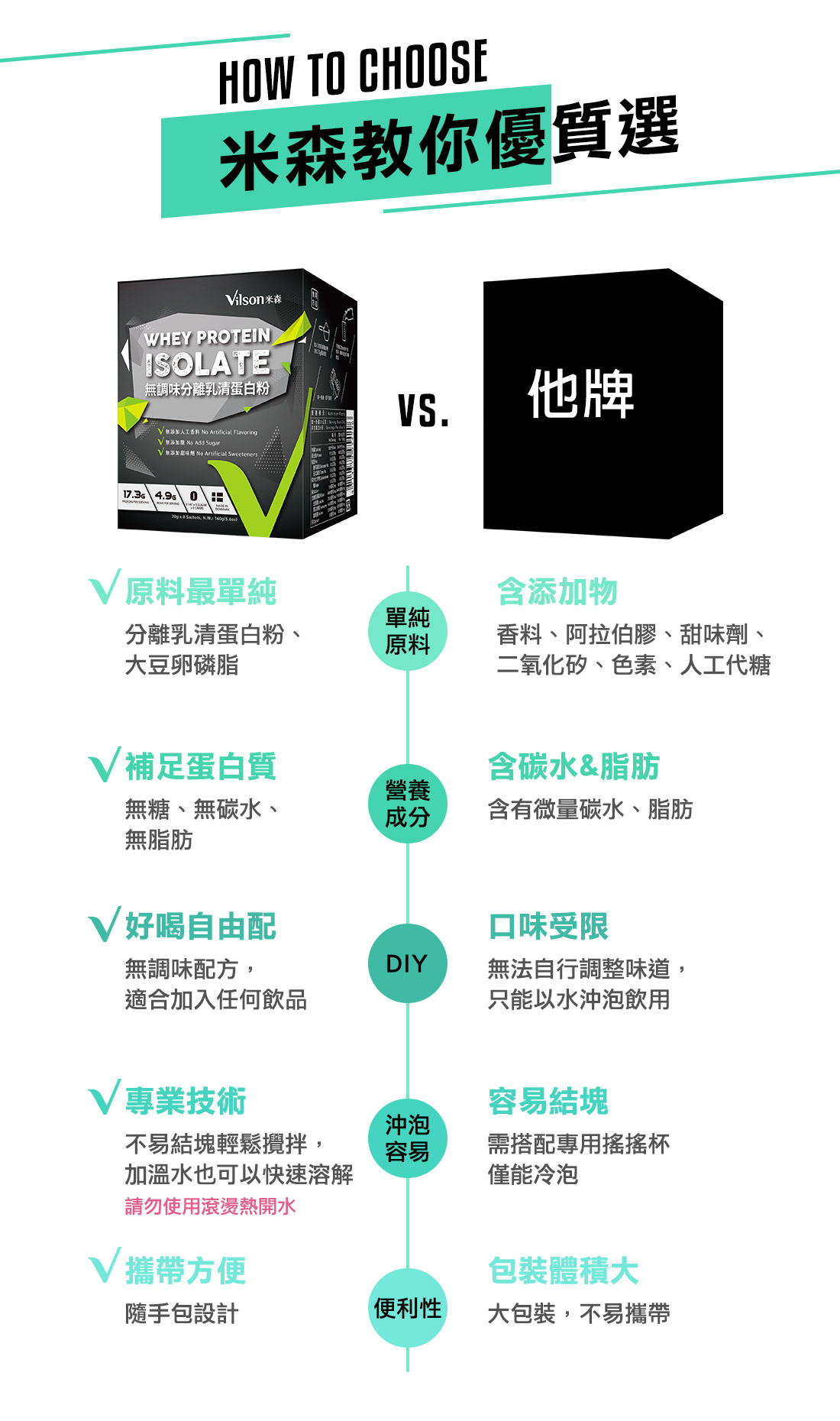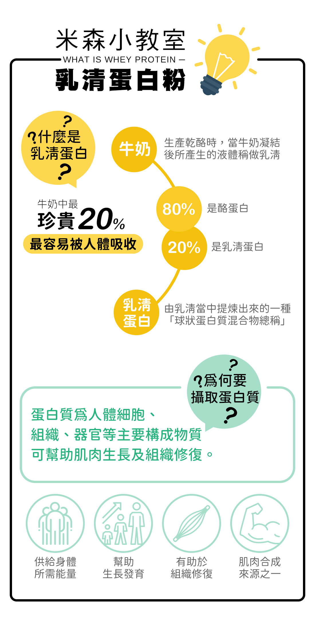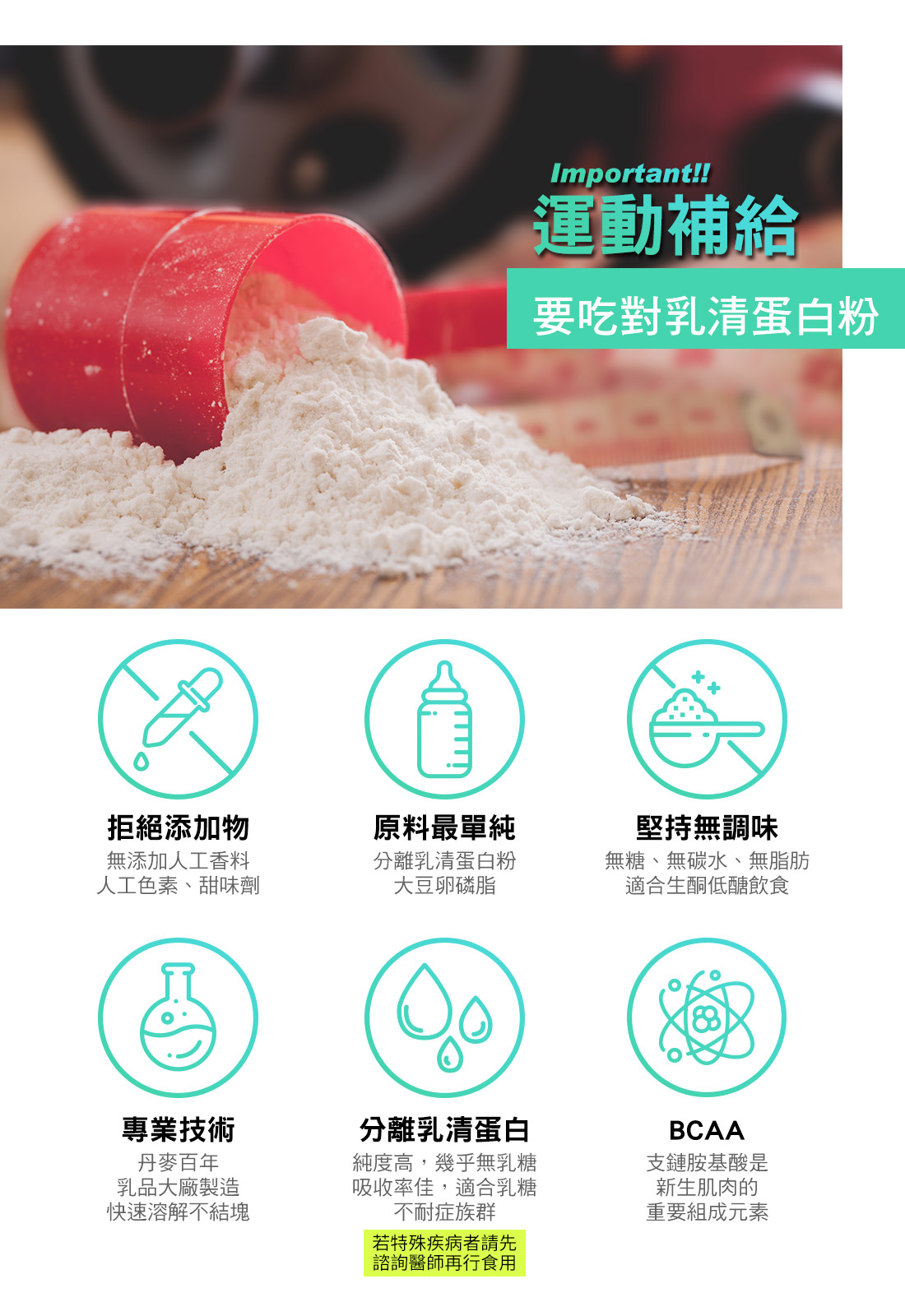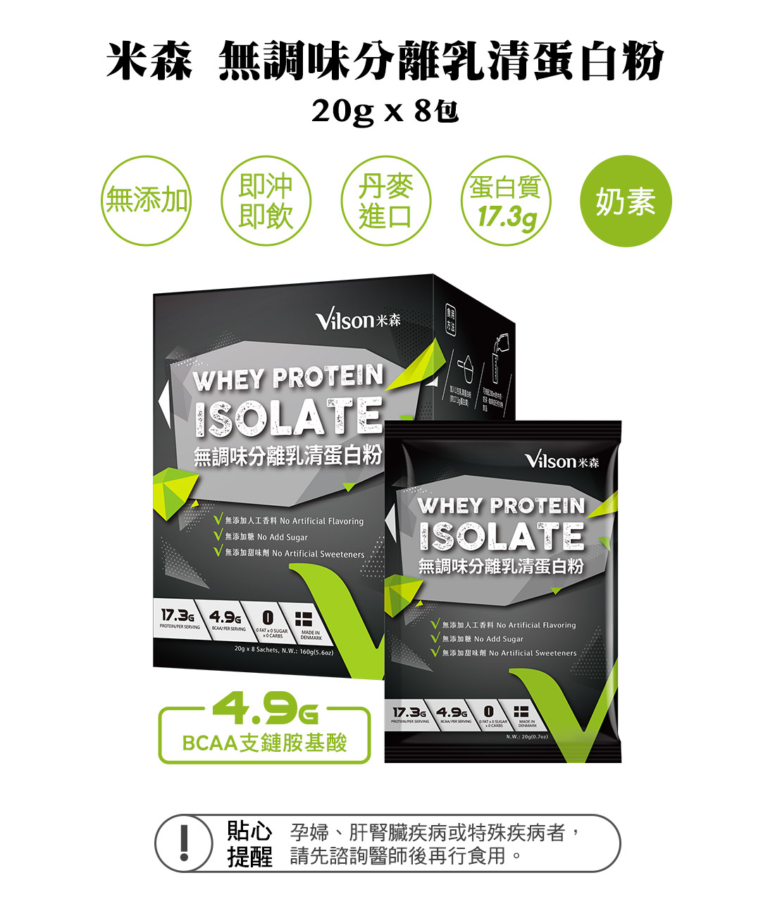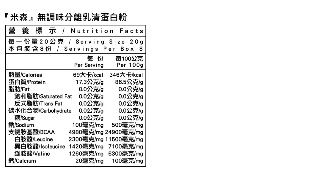 米森嚴選丹麥百年乳製品大廠製造的分離乳清蛋白粉,可快速溶解不結塊,堅持選用"無調味"分離乳清蛋白,不僅無糖、無碳水、無脂肪,並且純度高,幾乎無乳糖,吸收率佳,每份蛋白質達17.3公克,是重訓者的最佳補充品,也適合生酮低糖者飲食,可依照不同族群者一日所需蛋白質攝取,並搭配喜愛的飲品食用,隨意配自由吃,好放心
