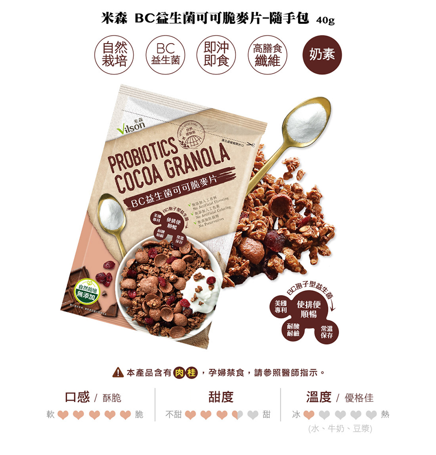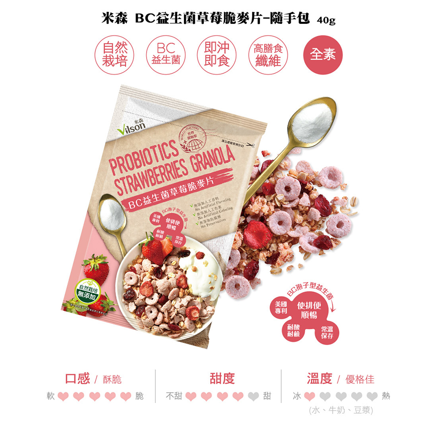 • 米森首創「BC 益生菌脆麥片」系列,每包含10億乳酸菌(BC30株),出廠數值確保菌種活性