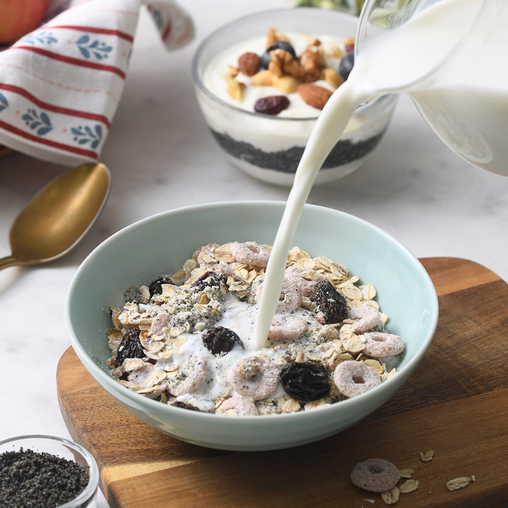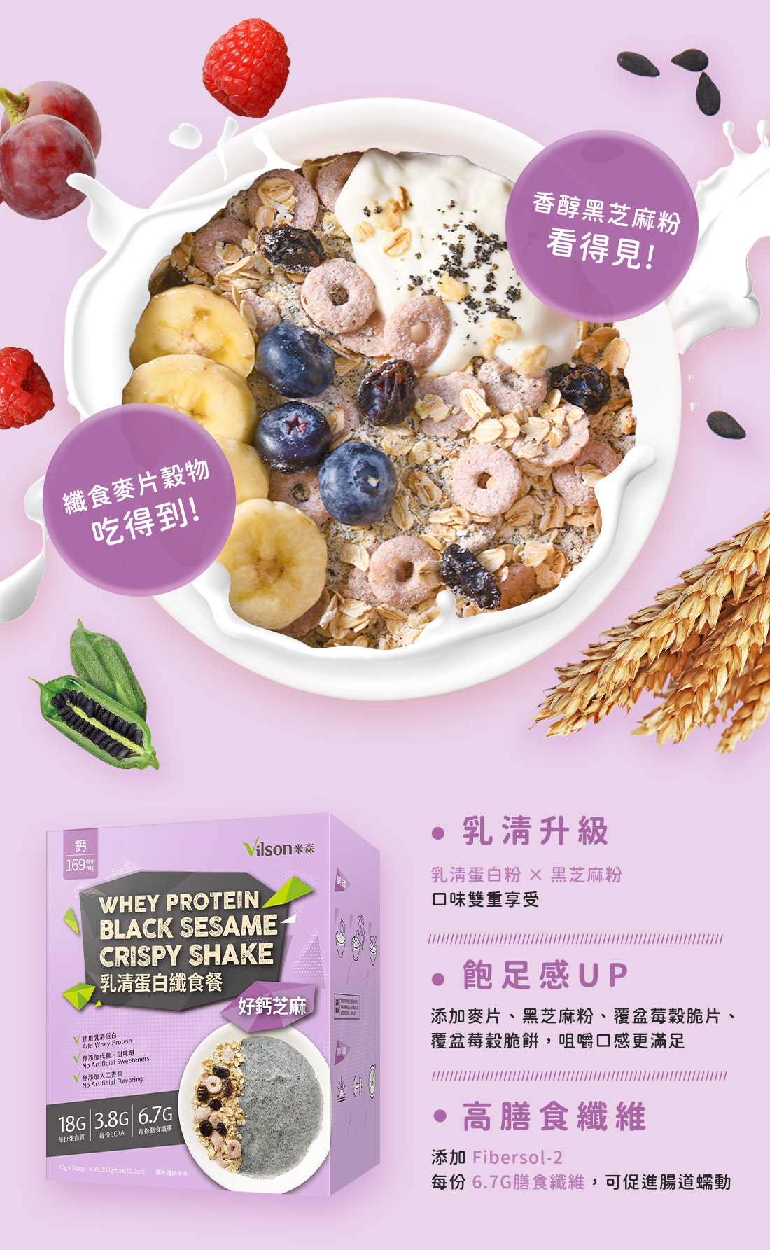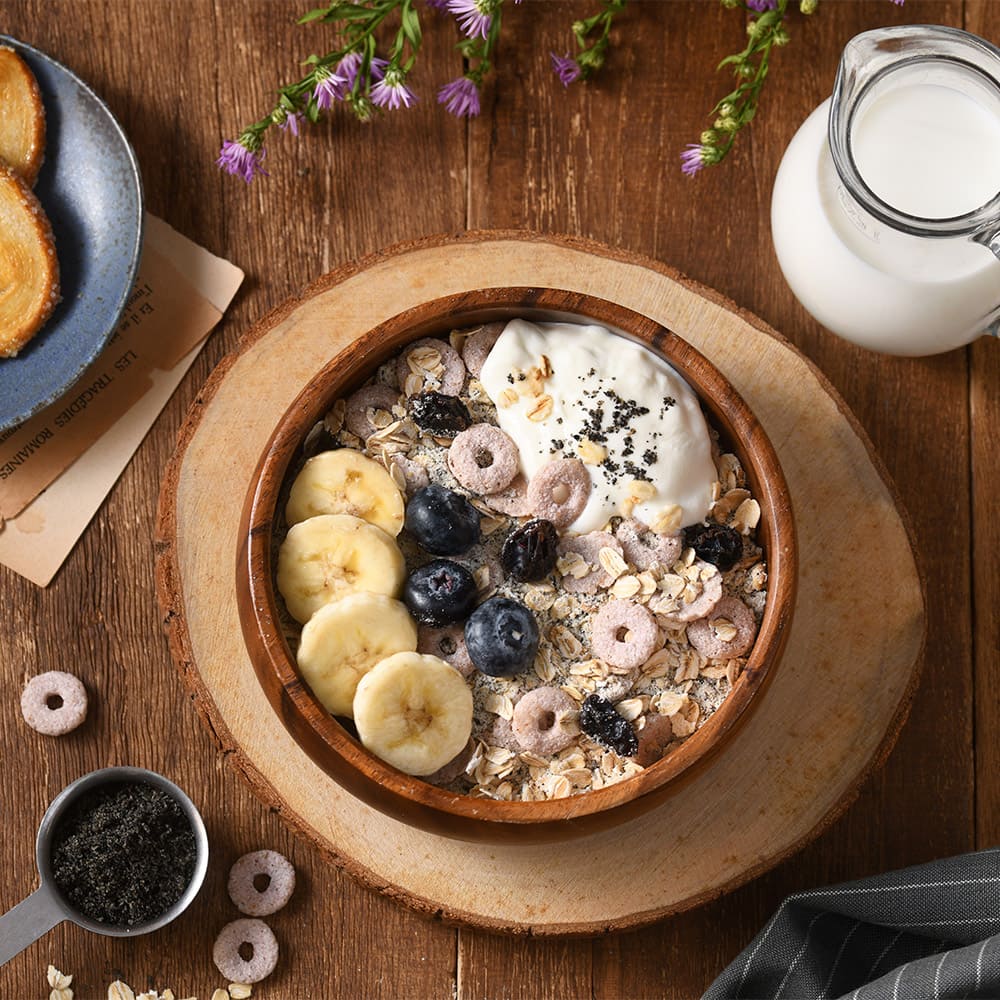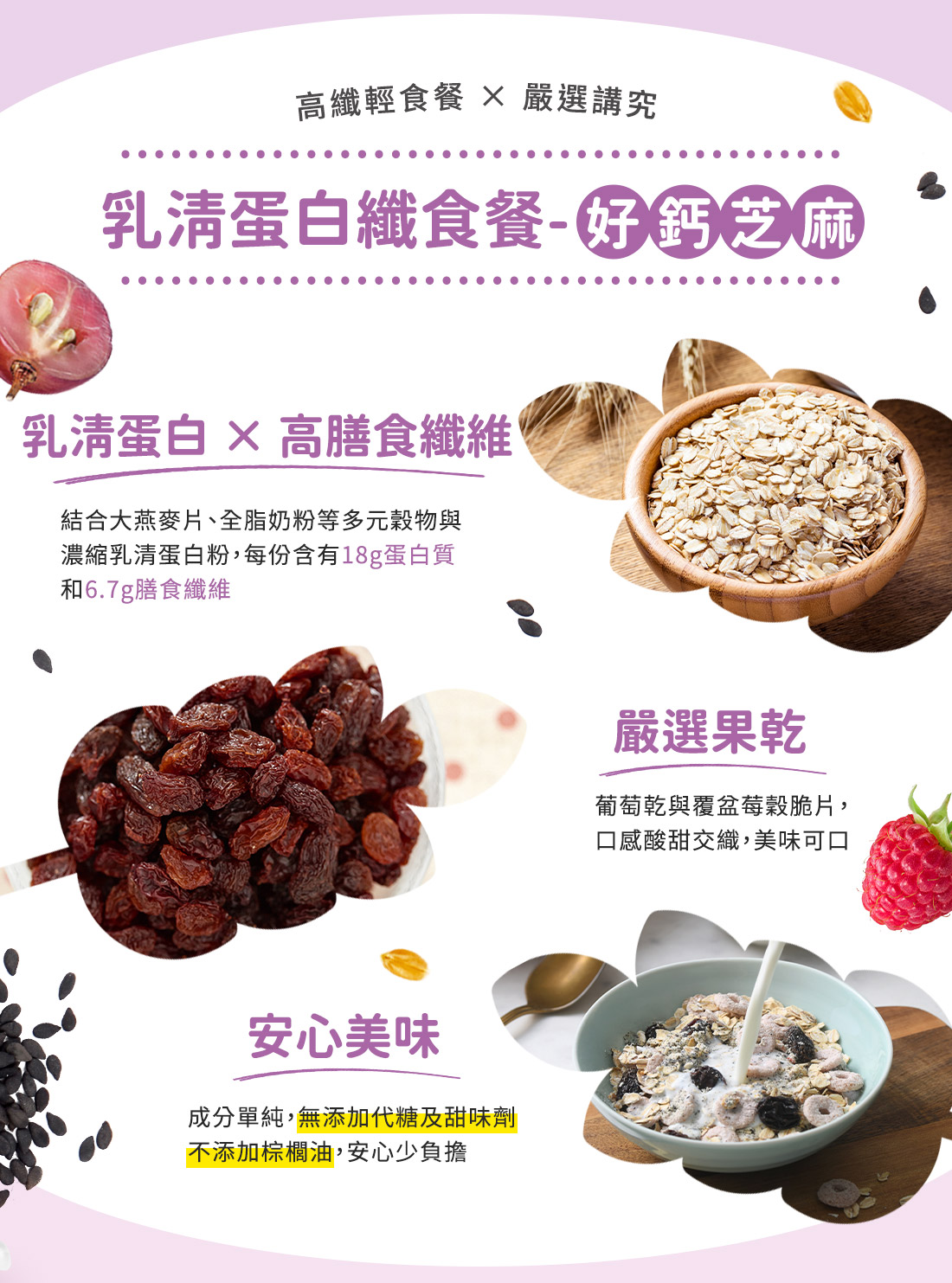 真食原料配方:大燕麥片、全脂奶粉、黑芝麻粉、覆盆莓穀脆餅等營養穀物