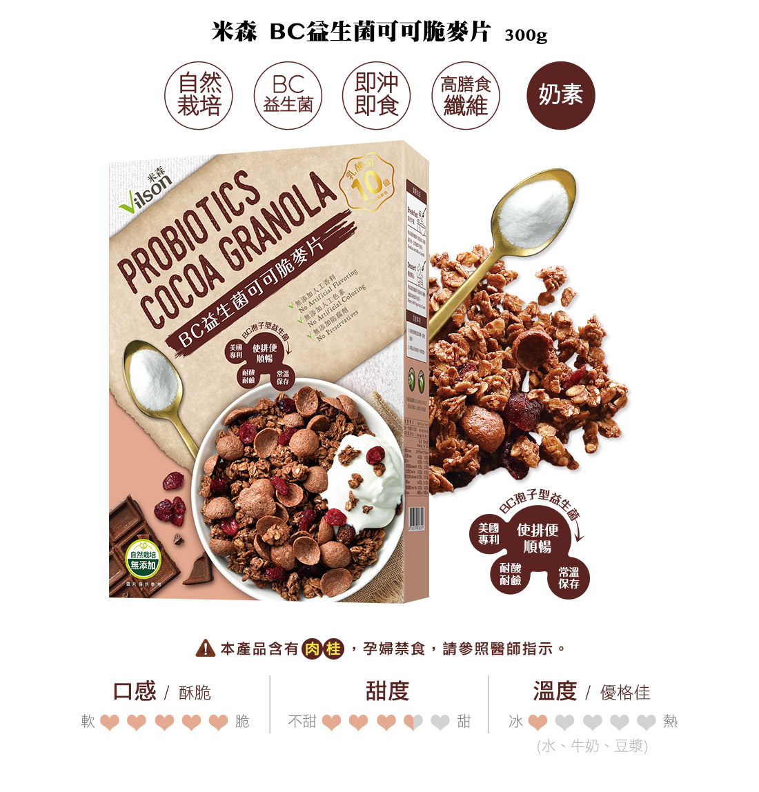 【米森 vilson】BC益生菌可可脆麥片 300g 2倍濃郁可可風味 含10億乳酸菌 高纖膳食纖維 幫助消化 無防腐劑 無人工香料色素