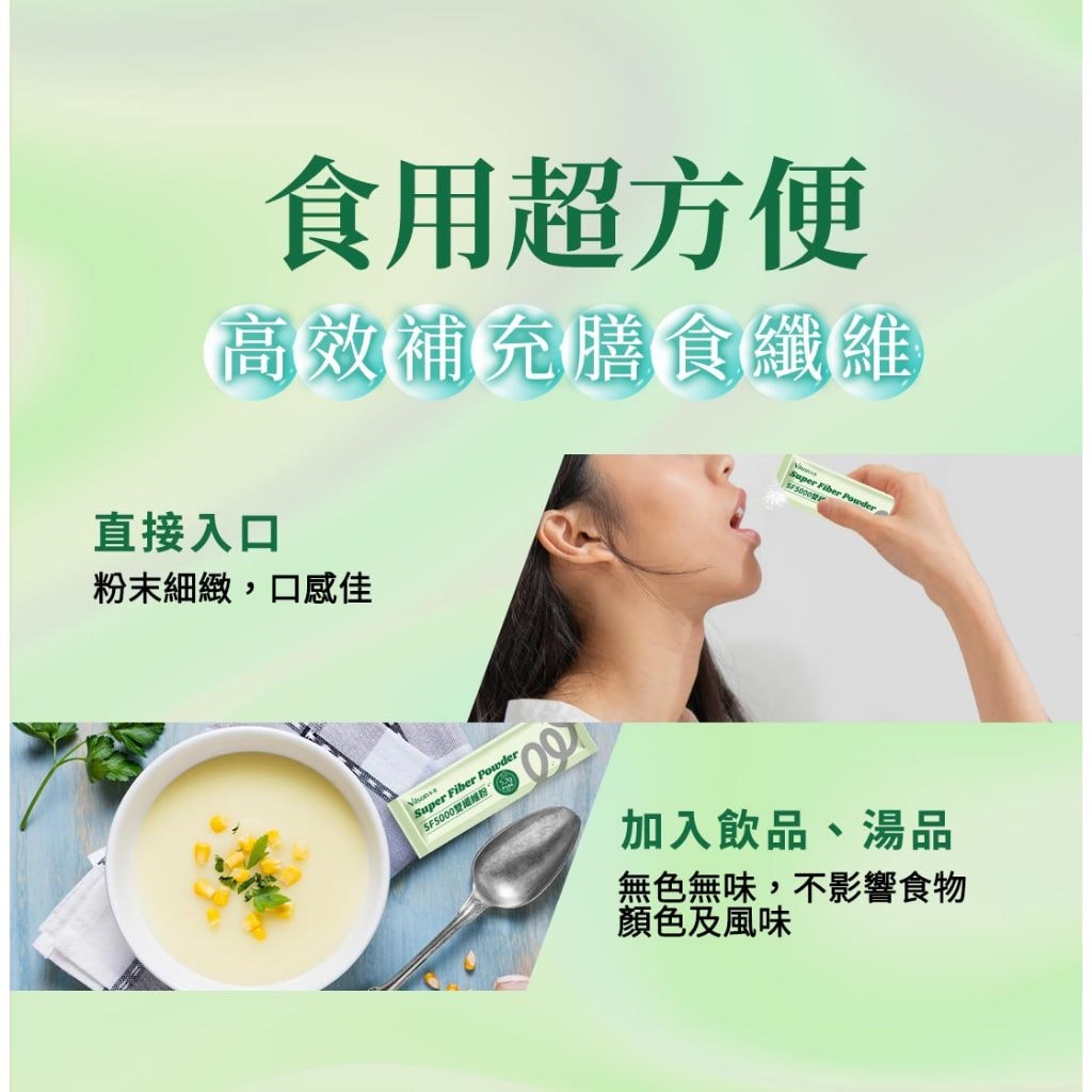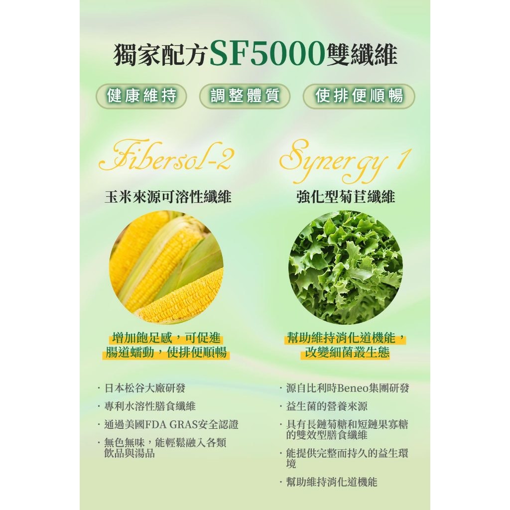 • 專利水溶性膳食纖維,來自植物,溫和不刺激。