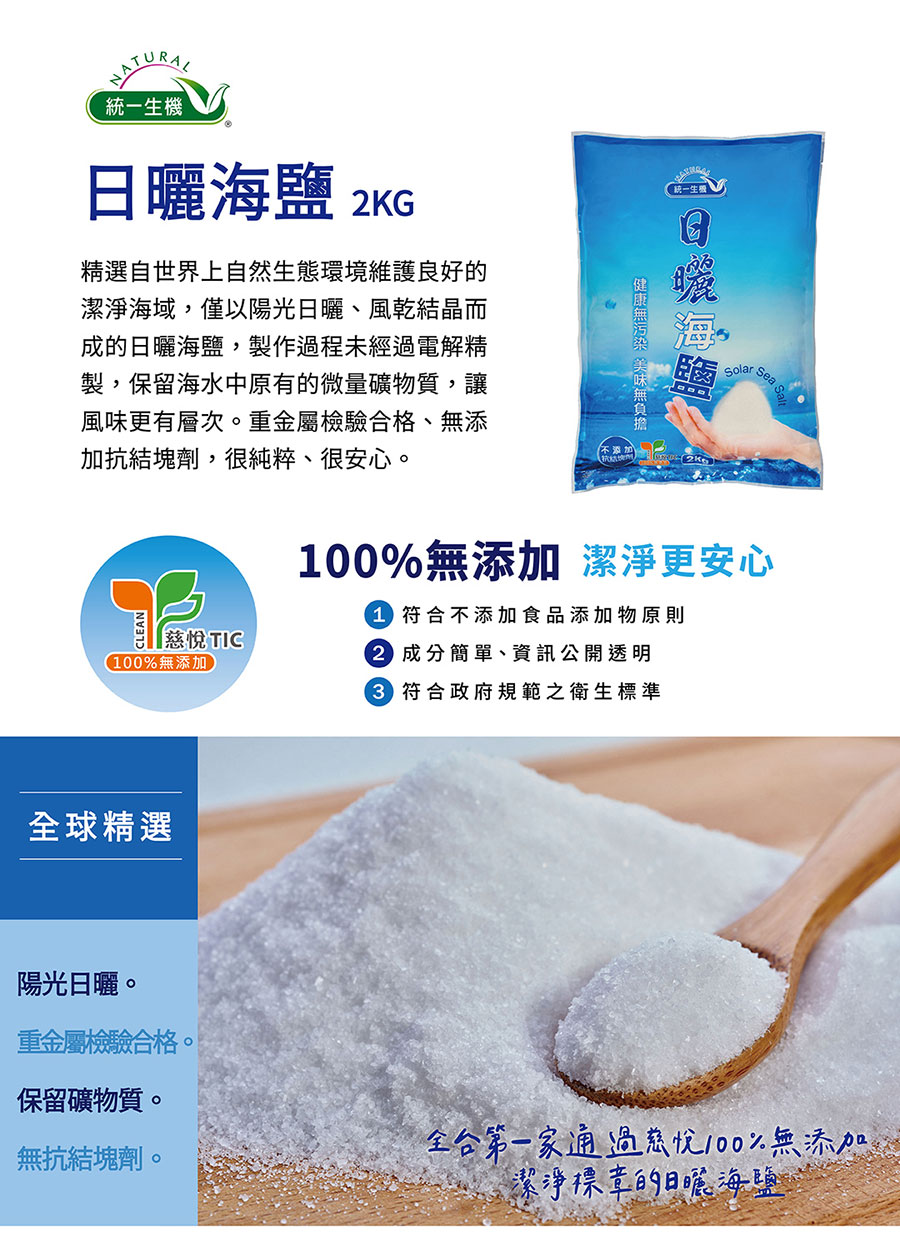 【統一生機】日曬海鹽 2kg 立袋|西班牙天然鹽田製成 無漂白 無抗結塊劑 保留礦物質 烹調燉煮適用