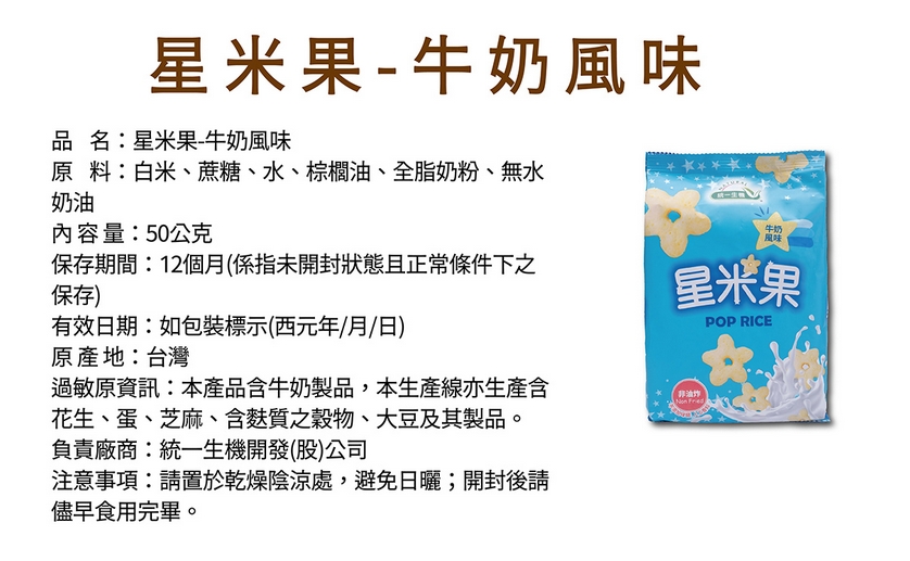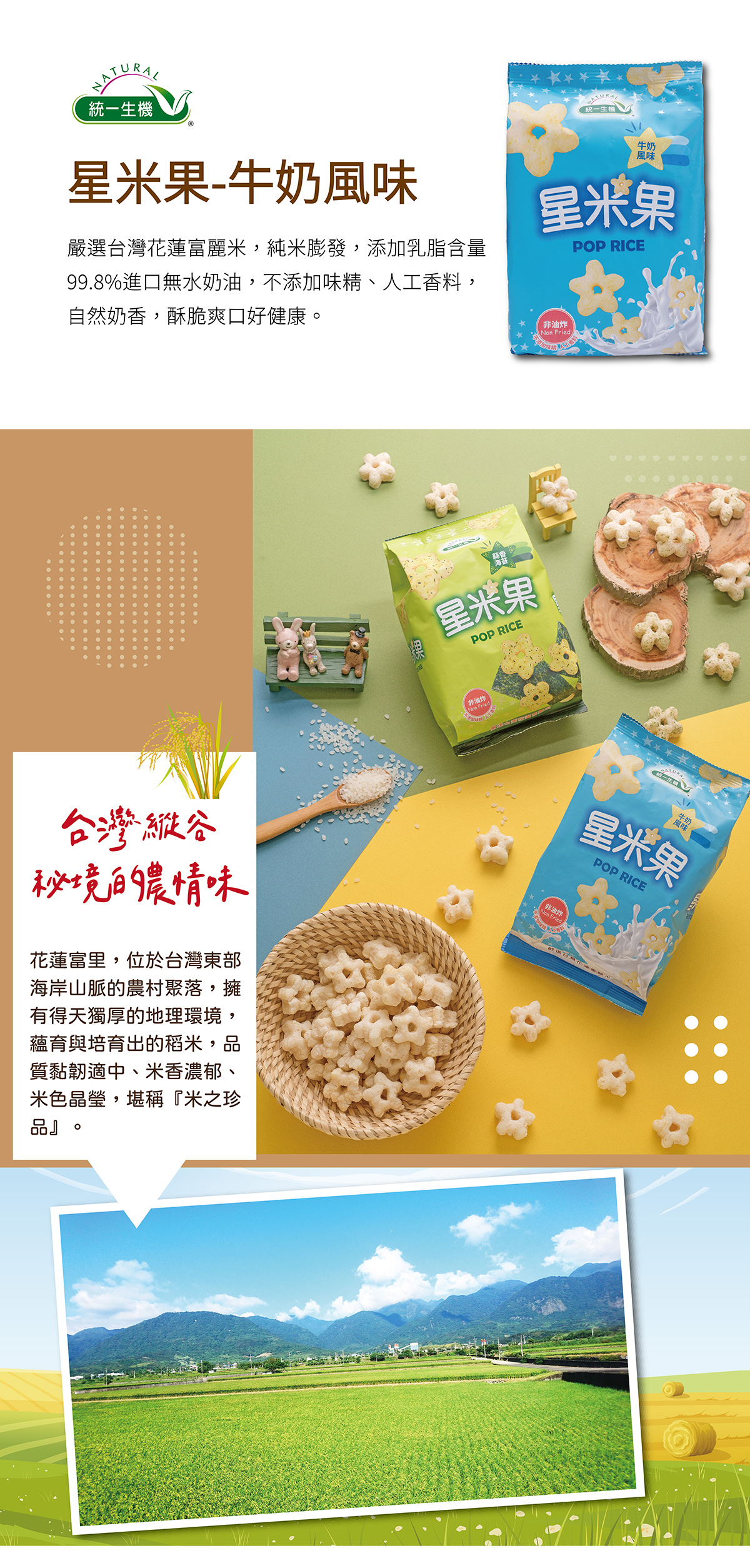 【統一生機】星米果 牛奶風味 50g/包|花蓮富麗米製成 無水奶油添加 無味精 無人工香料 米果零食