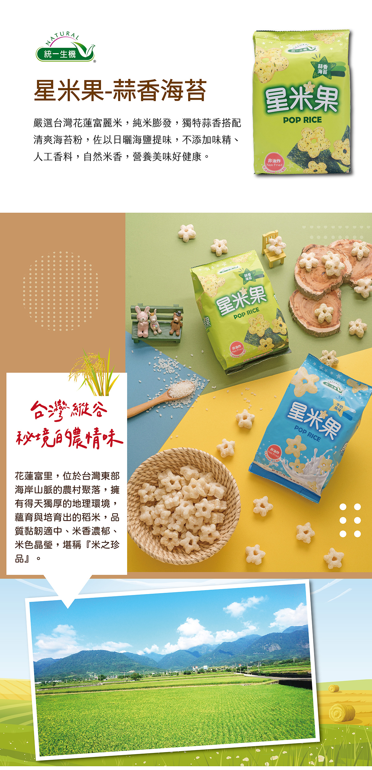 嚴選台灣花蓮富麗米,純米膨發,獨特蒜香搭配清爽海苔粉,佐以日曬海鹽提味,不添加味精、人工香料,自然米香,營養美味好健康。