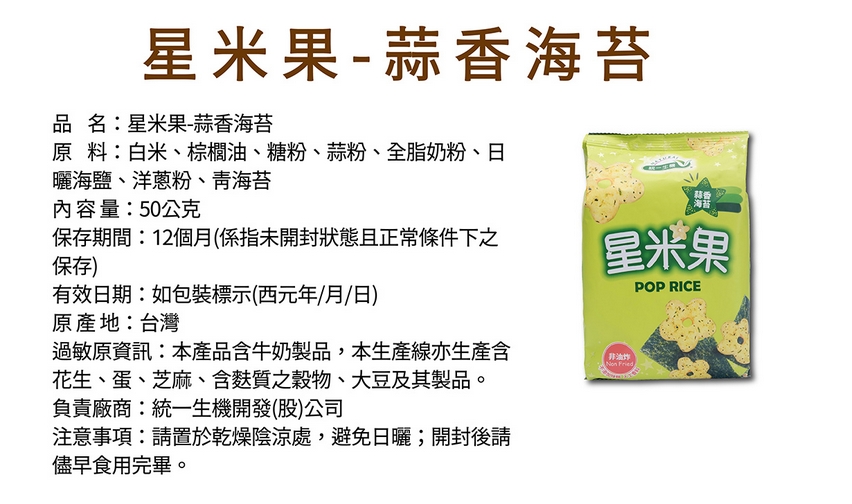 【統一生機】星米果 蒜香海苔 50g|花蓮富麗米|純米膨發|香脆健康零食