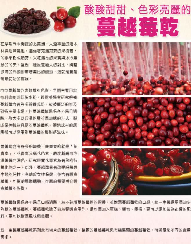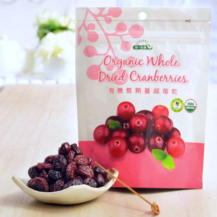 來自北美洲,採用整顆果粒製作而成,酸甜好滋味的蔓越莓乾,兼具營養、健康、口感,”有機””整顆”蔓越莓乾,整顆果粒讓您吃得有”感覺”,更因為它具有”有機”的身分,在食用上更不用擔心農藥殘留、人工色素等問題。