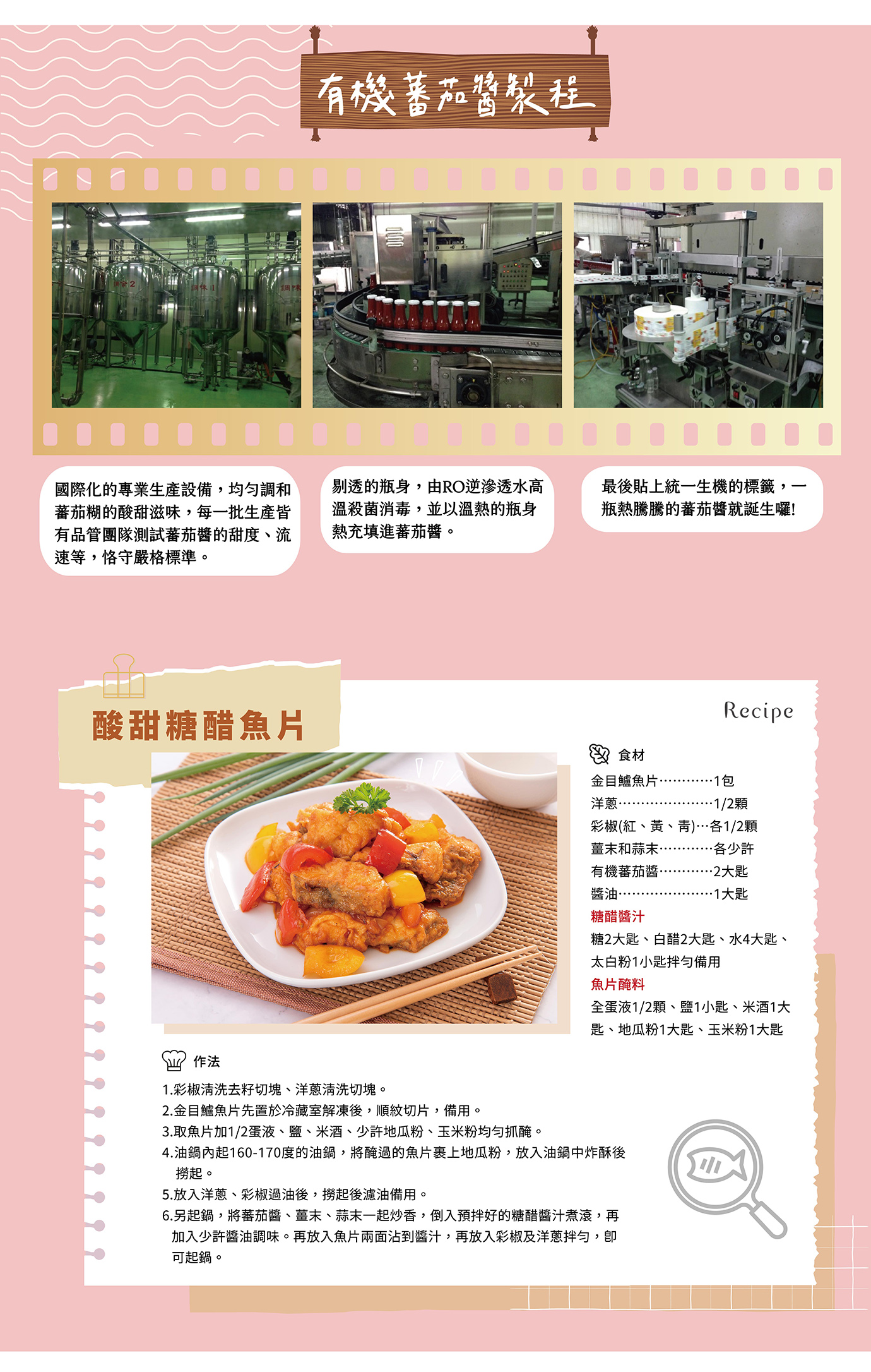採用進口美國有機蕃茄糊、巴西有機砂糖和台灣有機蘋果醋,來調配出道地口味的有機蕃茄醬,鮮紅濃稠、酸酸甜甜的口感,讓人垂涎欲滴,相當適合於中、西式料理的烹調使用。