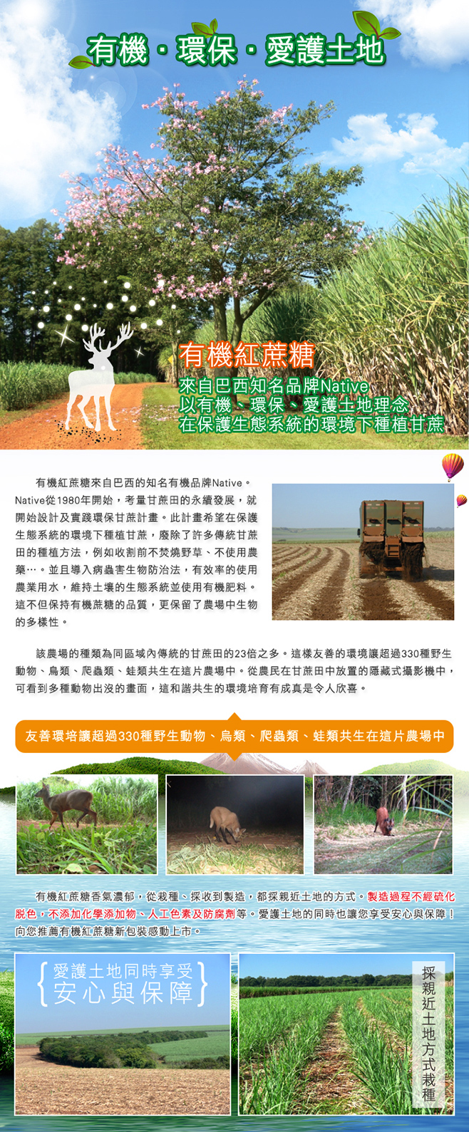 不使用農藥及化肥,生產及製造均符合有機規範。和野生動物及植物共生,保有產地的生物多樣性。愛護地球同時也讓您享受安心與保障!