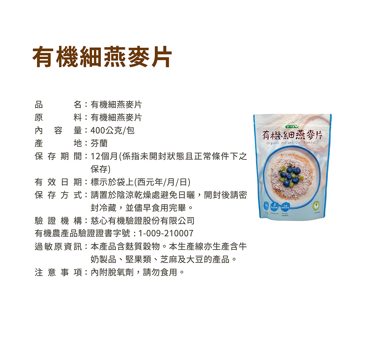 嚴選自北歐芬蘭產地,透過有機栽種產出高品質燕麥。不經過化學藥物薰蒸及食輻照射來延長保存,安心享受穀物原始美好。細薄好入口,更適合長輩及兒童!