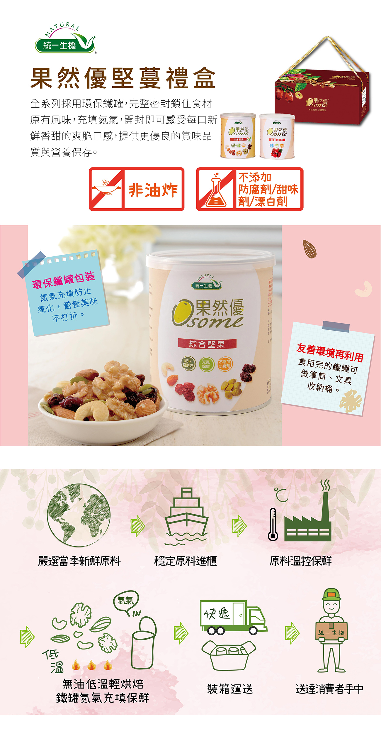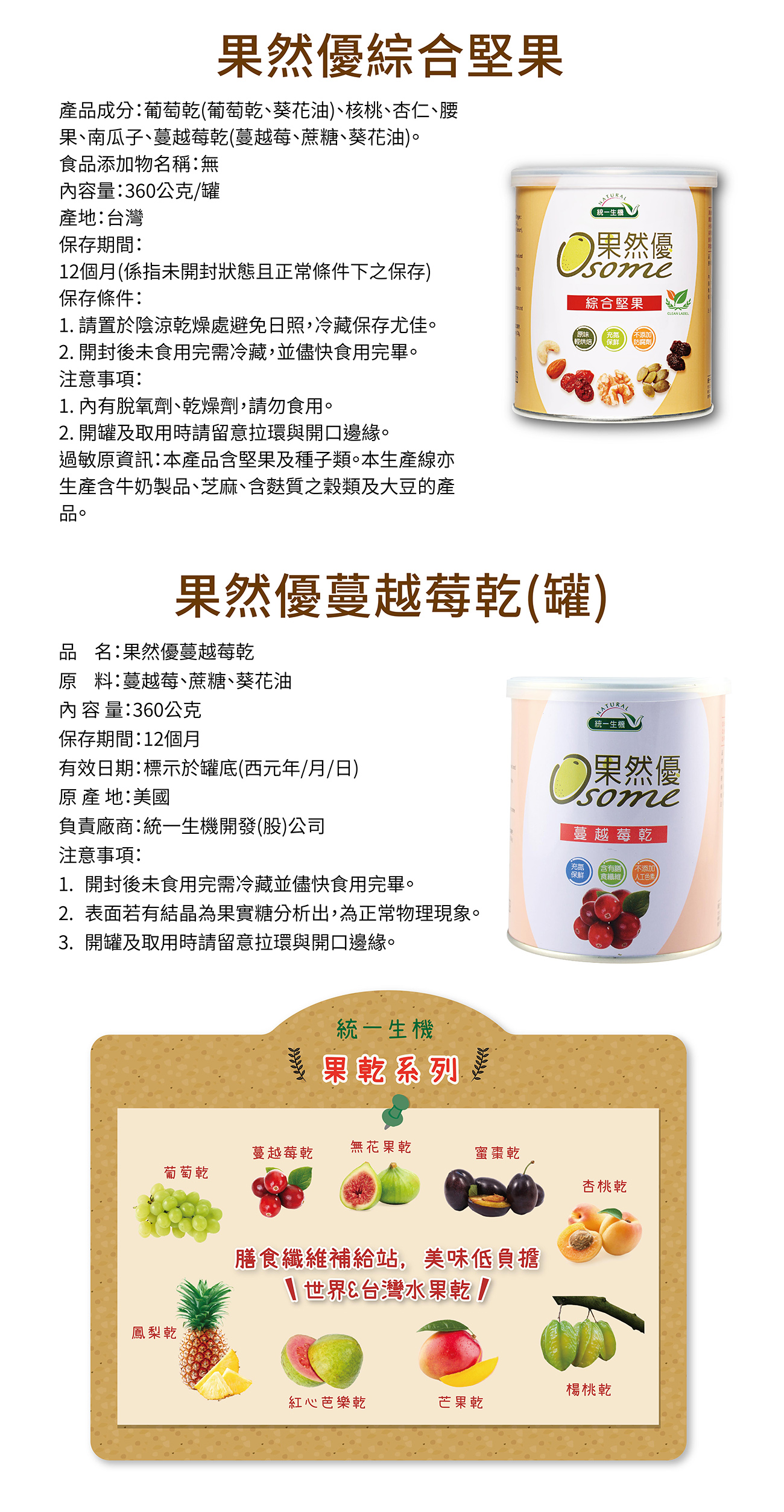 【統一生機】果然優堅蔓禮盒|低溫輕烘焙綜合堅果360g+蔓越莓乾360g|原味堅果果乾組