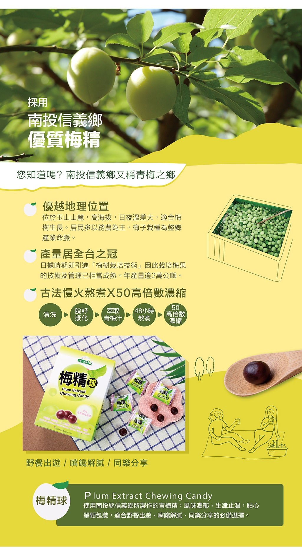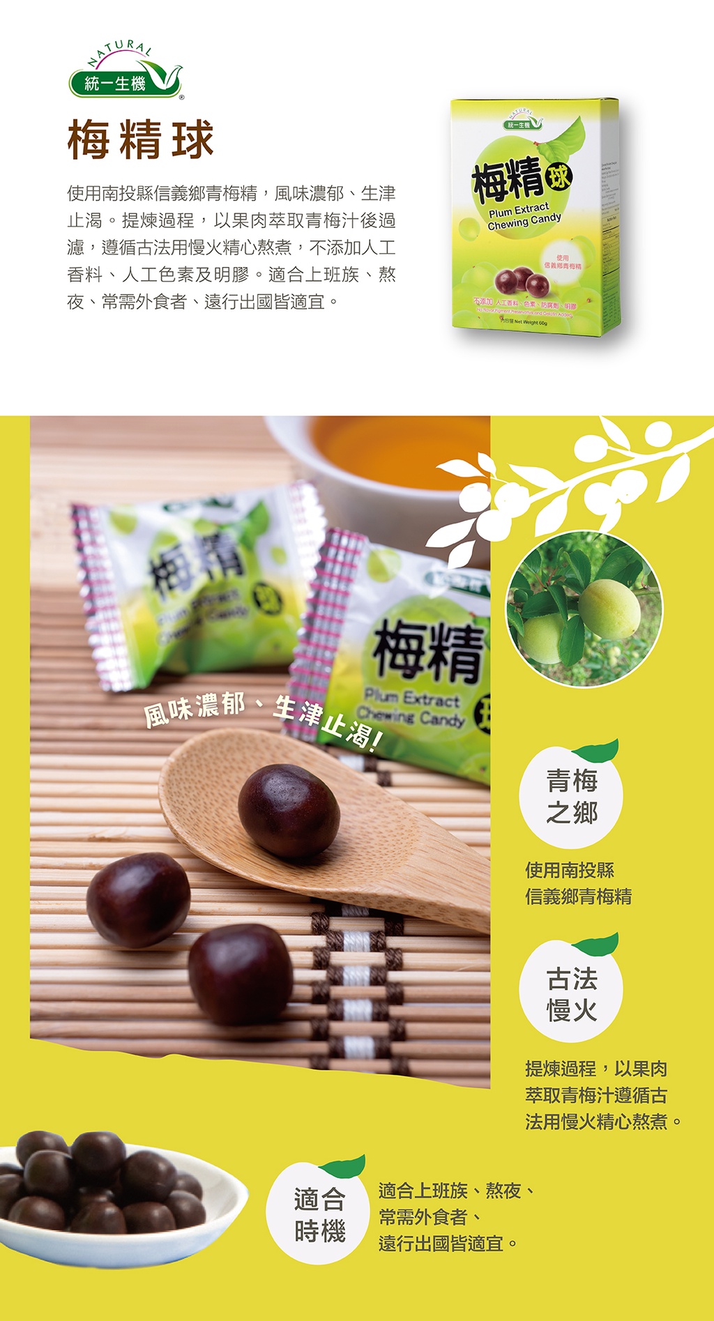 產品特色:使用南投信義鄉青梅精製成,風味濃郁、生津止渴。經過古法慢火熬煮,提煉過程不添加人工香料、人工色素及明膠,保證天然健康。適合上班族、熬夜、常需外食者,遠行出國皆適宜。