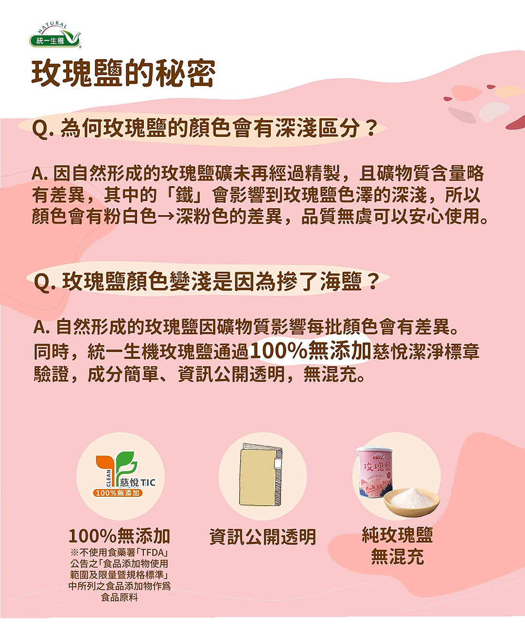 • 不添加人工色素、不經化學精製、不添加抗結塊劑,成分單純僅岩鹽。
