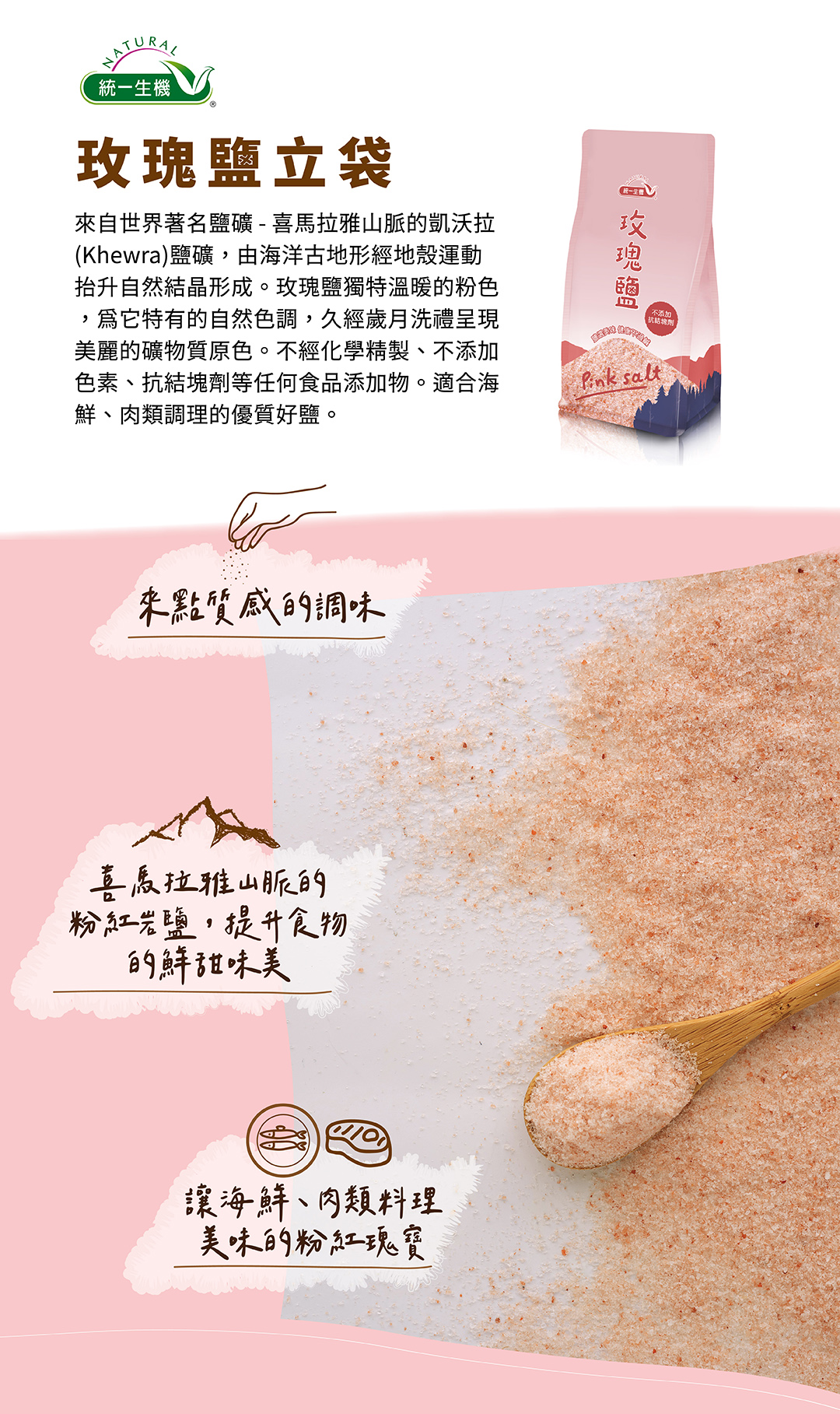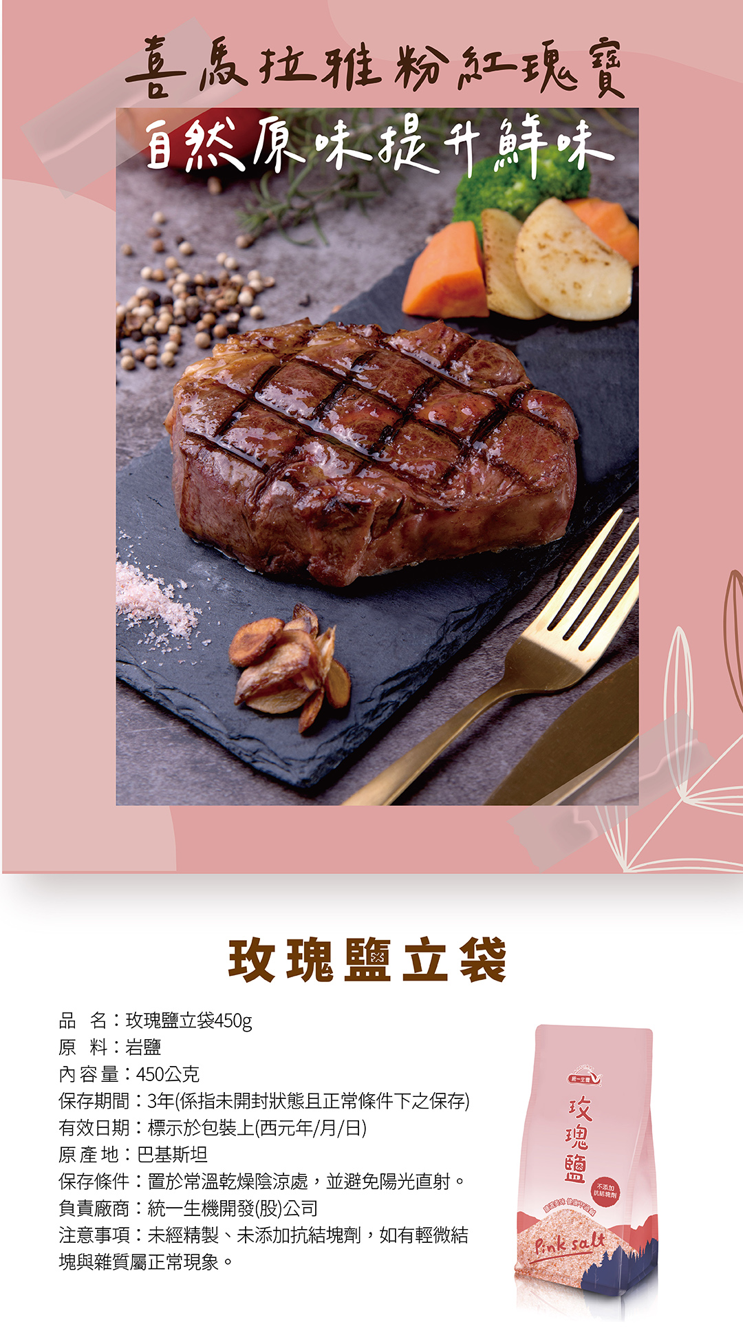 【統一生機】玫瑰鹽立袋 450g|巴基斯坦喜馬拉雅山脈鹽礦|無人工色素 × 不經化學精製|重金屬檢驗合格|肉類海鮮料理提鮮首選