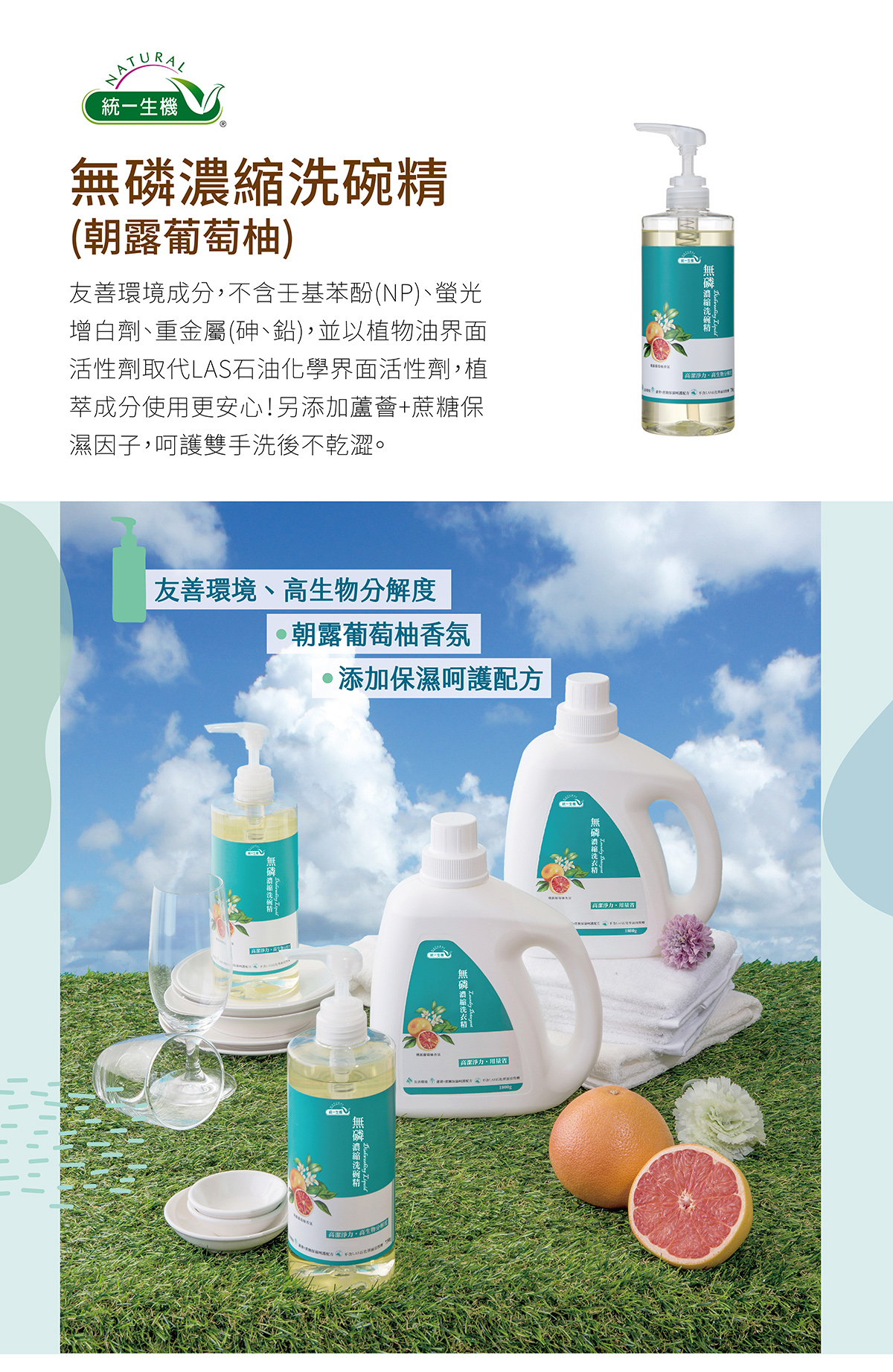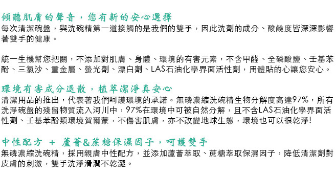統一生機推出全新系列~清潔用品,不含甲醛、全磷酸鹽、壬基苯酚、三氯沙、重金屬、螢光劑、漂白劑,讓您用得安心,也跟我們一起守護環境!