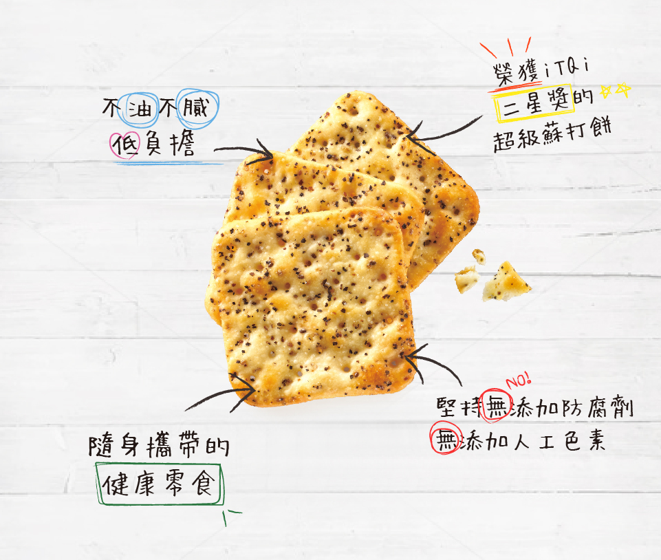 | 成份 | 小麥麵粉(無漂白)、棕櫚油(未氫化)、糖、香辛料粉(白胡椒、黑胡椒、花椒、羅勒、小茴香、迷迭香、玉桂粉)、乳酪粉、岩鹽、酵母粉、碳酸氫鈉(食用小蘇打) |