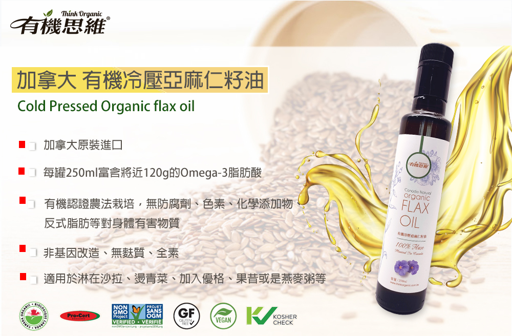 【自然思維】有機冷壓初榨亞麻仁籽油 250ml/瓶 有機亞麻仁籽油 富含O-mega3 100%冷壓初榨