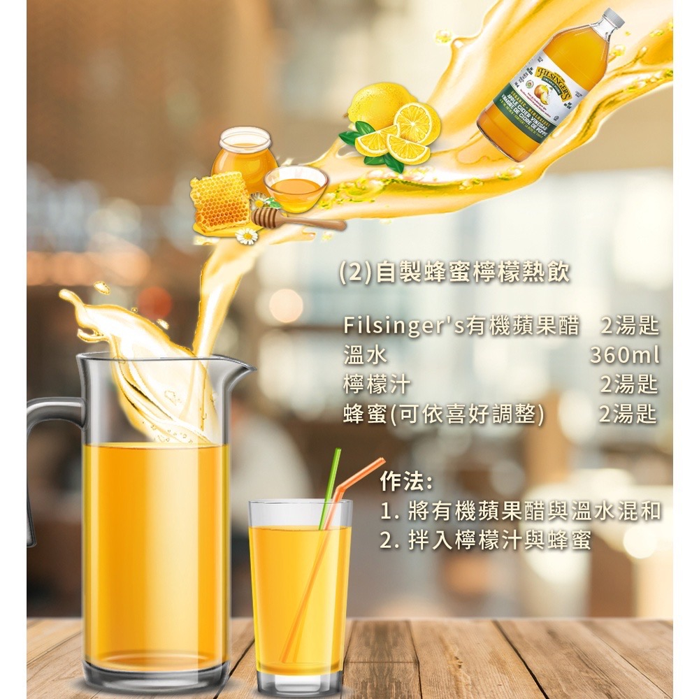 - 945ml 大容量,適合沙拉佐料、烹飪料理或稀釋飲用(醋與水最低比例 1:10,可添加蜂蜜增添風味)。