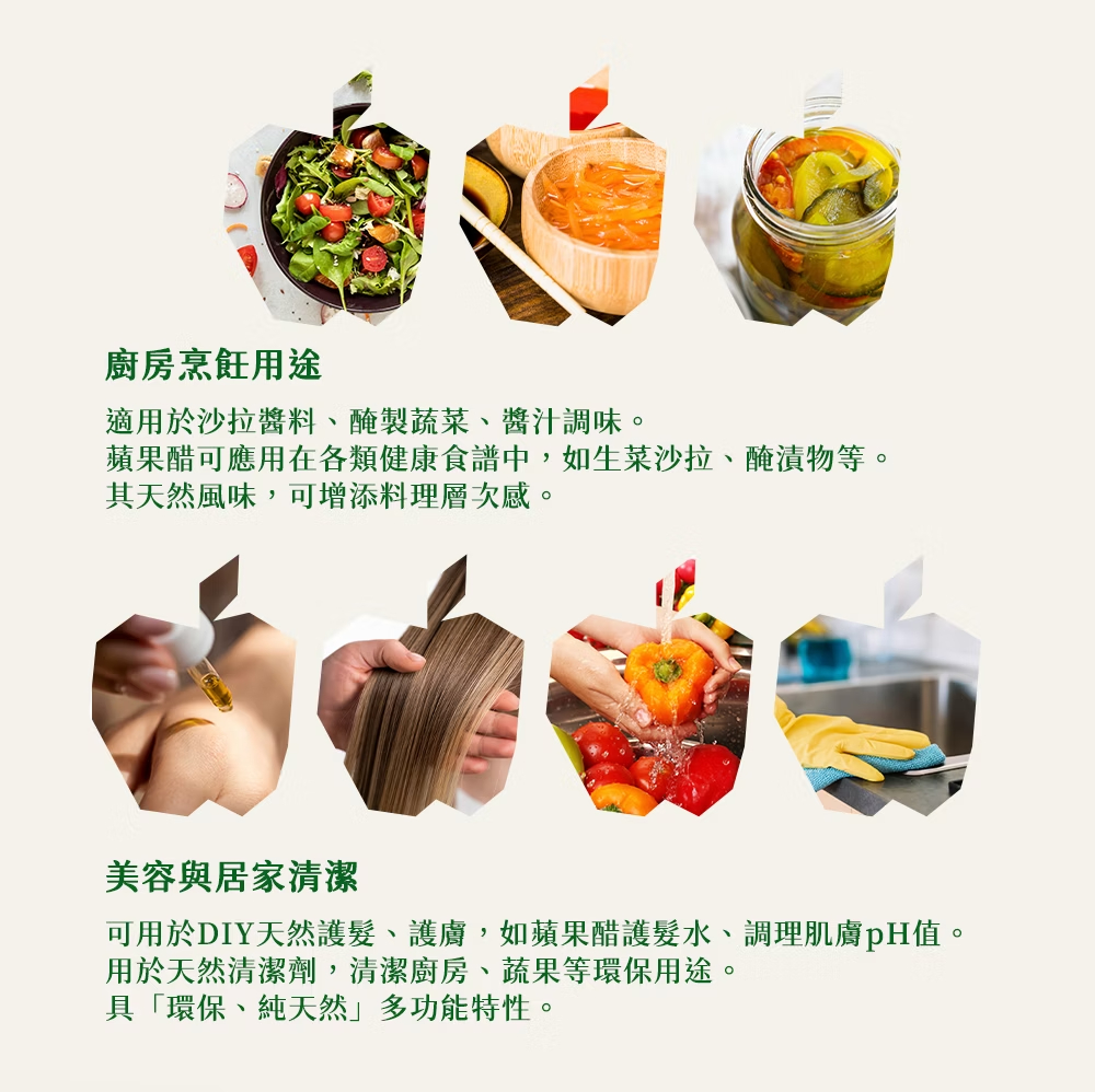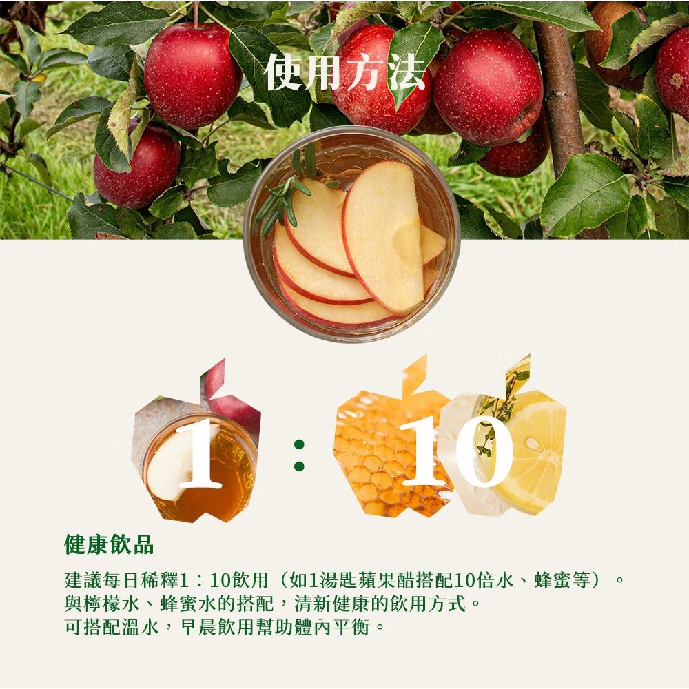 ★適用於調配成沙拉佐料或是烹飪,如飲用,醋與水最低比例為1:10 (添加蜂蜜風味更佳)