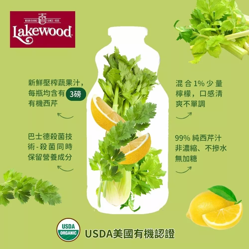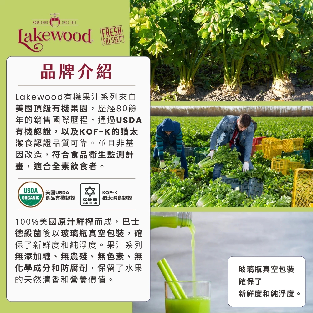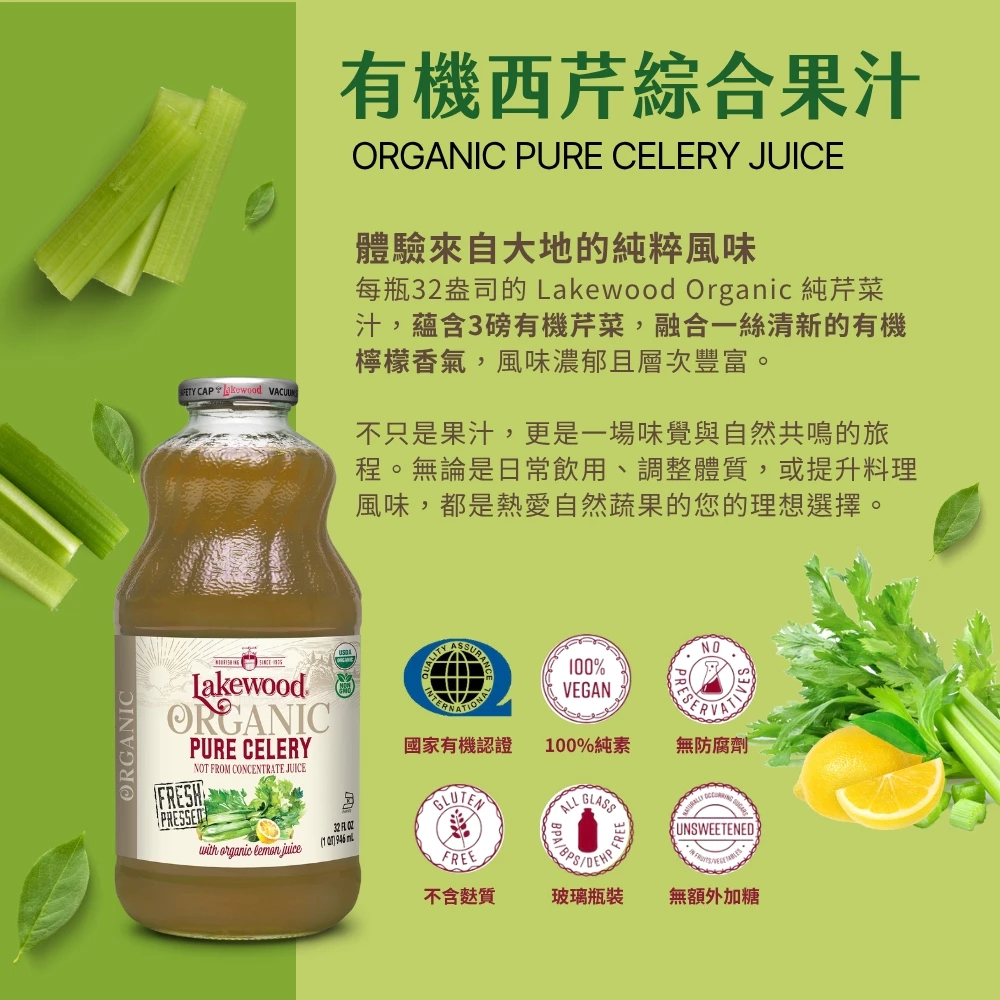 嚴選美國原裝 Lakewood 有機西芹綜合果汁,100%新鮮壓榨非濃縮,採用有機西芹+有機檸檬雙配方,自然清爽、無香料、無加糖、無色素,通過 USDA 有機與猶太潔食雙認證,安心純淨。全程玻璃瓶真空包裝,不含 BPA/BPS/DEHP,為每日排毒補水的清爽首選。