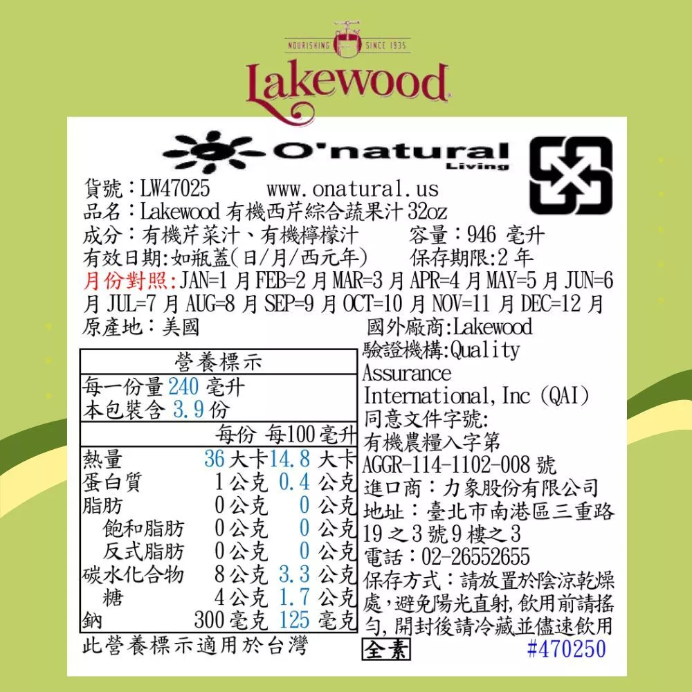 【O’natural 歐納丘】Lakewood 有機西芹綜合果汁 946ml|100%有機|無加糖|無香料|純榨原汁