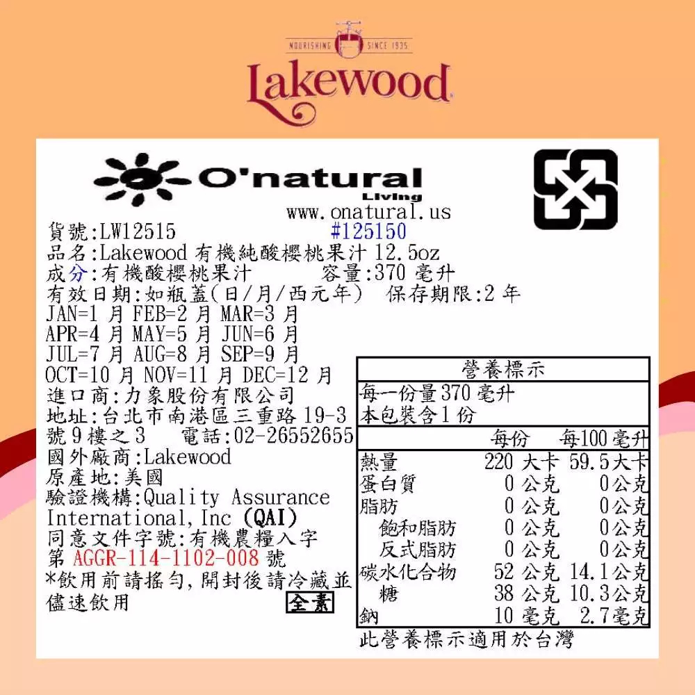 【O'natural 歐納丘】 Lakewood 有機純酸櫻桃果汁 370ml 無加糖 無色素 無香料 100%果汁