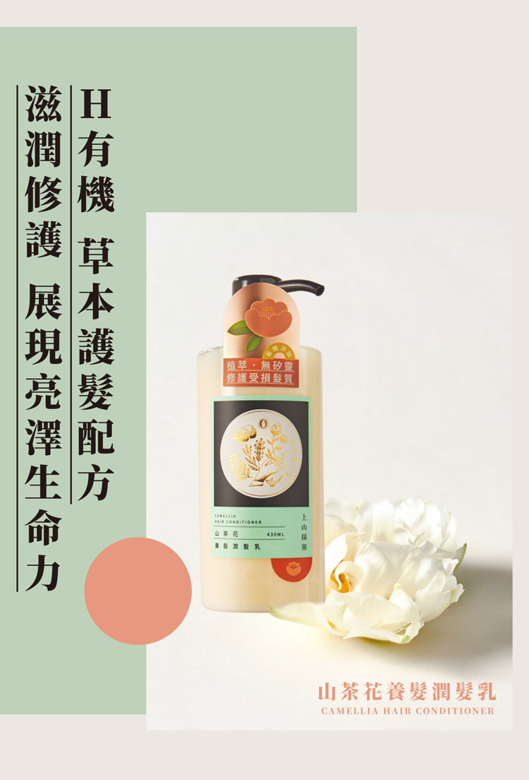 山茶花養髮潤髮乳 以山茶花萃取為核心,搭配有機蘆薈萃取與護髮因子,從髮芯到髮絲外層深層滋潤,維他命原 B5 添加讓髮絲呈現柔嫩光澤感。植萃無矽靈配方,所有髮質皆適用,洗髮後取適量均勻塗抹,靜置 3–5 分鐘後清水沖淨,讓每次護髮都宛如五星飯店 SPA 般的享受體驗。