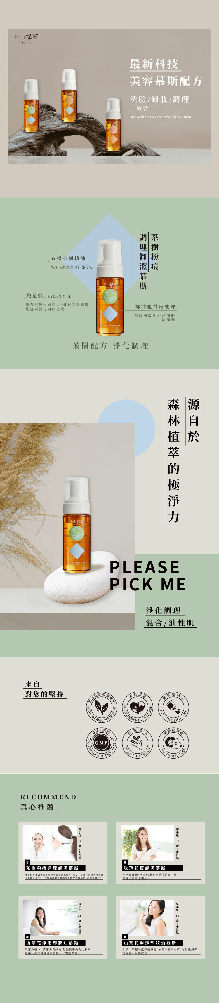 tsaio 上山採藥茶樹粉痘調理卸潔慕斯,採用最新美容慕斯配方,集洗臉、卸妝、調理三效於一瓶,為混合性與油性肌膚設計的日常清潔解方。以有機茶樹精油為核心成分,取自天然植物的抑菌因子,有效淨化毛孔、調理出油狀況;搭配鋅花酵(Zn-CYMEN-5 OL)強化調理力,針對粉刺與痘痘問題肌膚提供科學支持;鞘脂醯甘氨酸鋅則作為低刺激性清潔劑,洗淨力穩定又溫和,不造成肌膚負擔。源自森林植萃的極淨力,GMP 認證製造,每日早晚使用,讓肌膚維持清爽平衡的健康狀態。