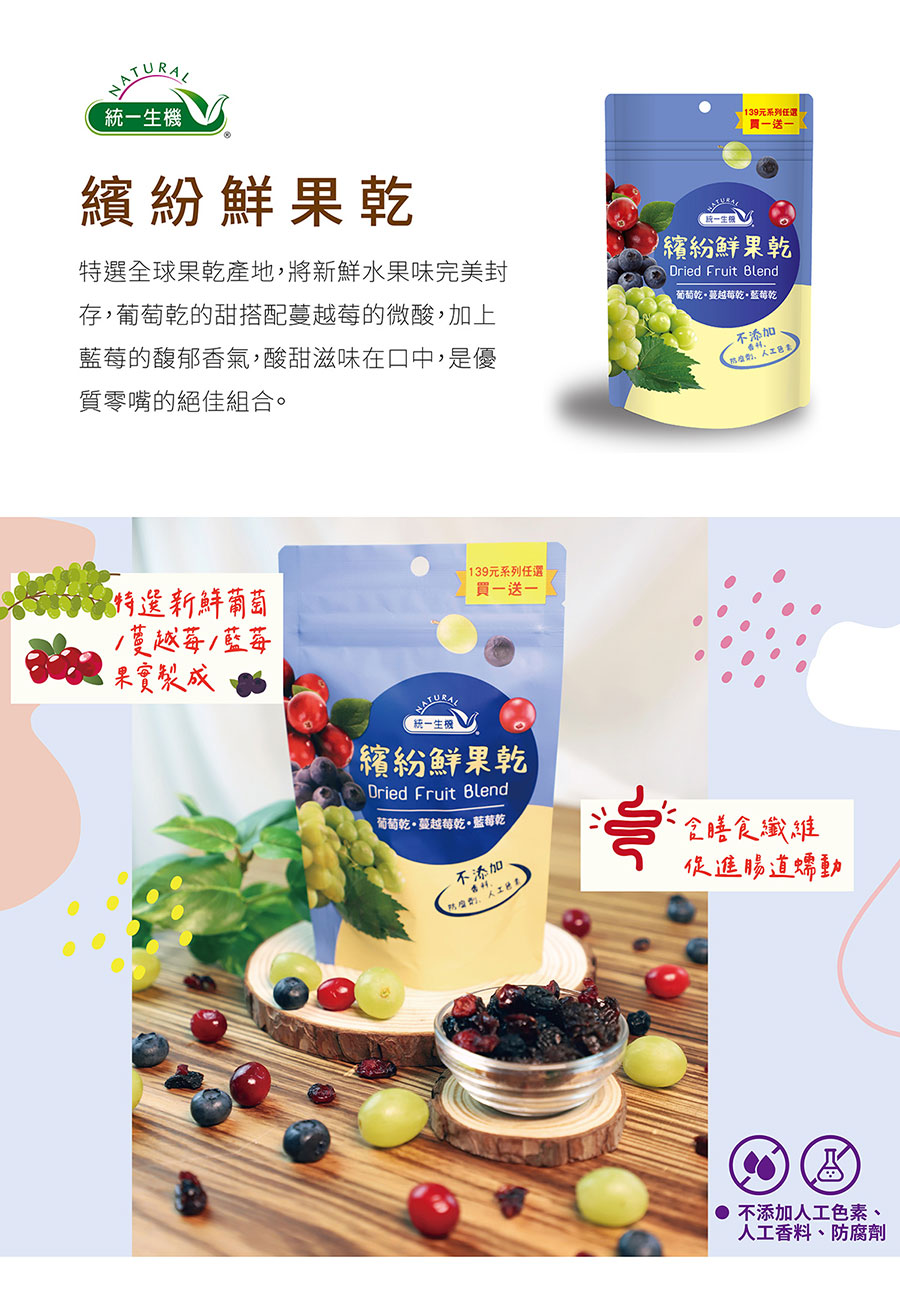 • 特選三大產地原料:智利葡萄乾的甜蜜、美國蔓越莓乾的微酸、美國藍莓乾的馥郁香氣,酸甜層次在口中相互搭配。