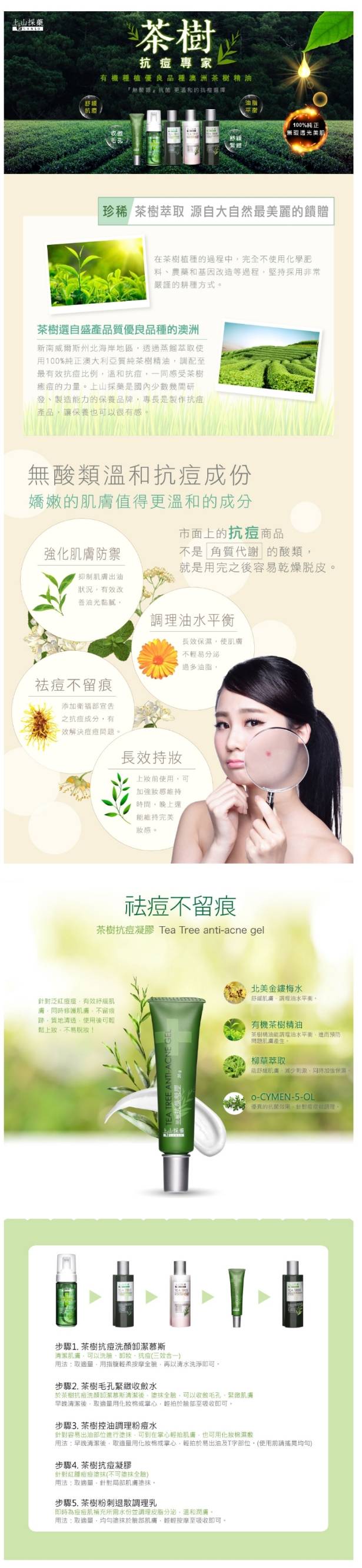 含IPMP抗菌成分,有效紓緩痘痘不適,減緩膚況嚴重;搭配有機茶樹精油、柳草萃取、北美金縷梅水潤澤調理肌膚,維持水分、不乾燥脫屑,質地清爽,化妝前後均可使用。