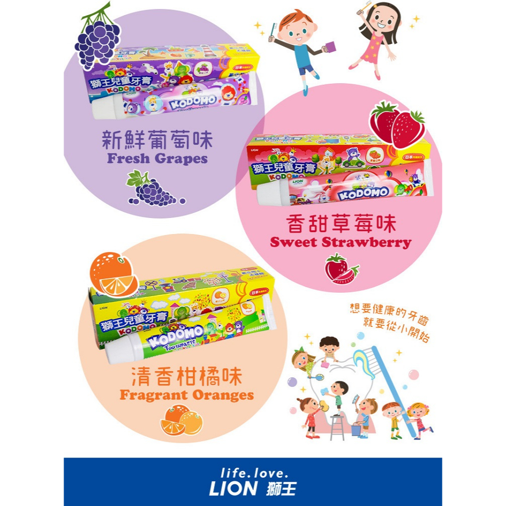 【日本獅王 LION】兒童牙膏45g×3條(草莓/葡萄/橘子)+ 3-6歲兒童麵包超人牙刷(顏色隨機)