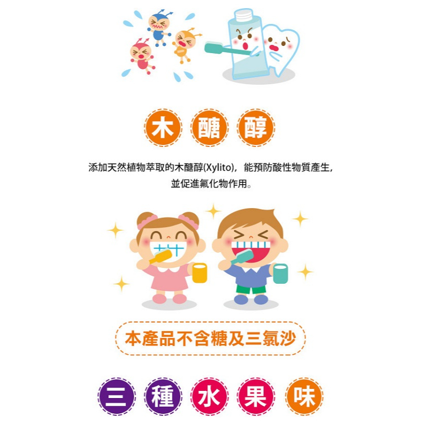 3 不含糖及三氯沙。 配合正確刷牙習慣,透過牙齒再礦化修護早期蛀牙之琺瑯質損傷。