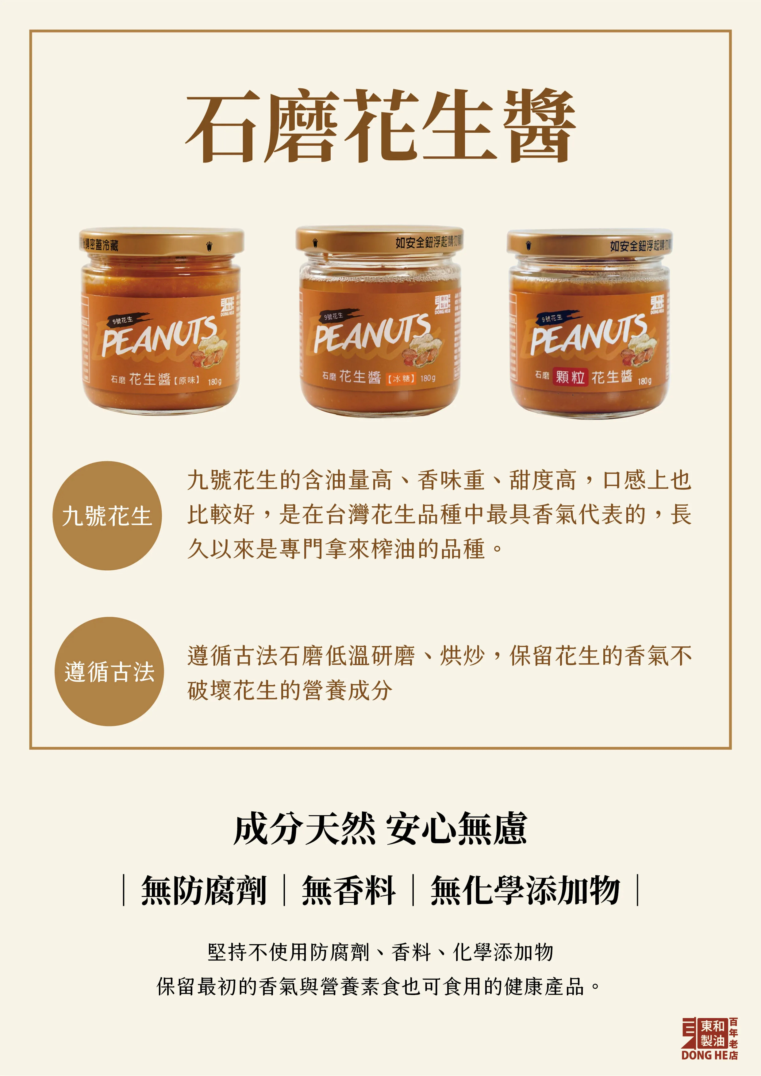 採用古法以石磨研磨,保留花生的營養精華,滿足您營養健康、口感好吃的雙重需求。