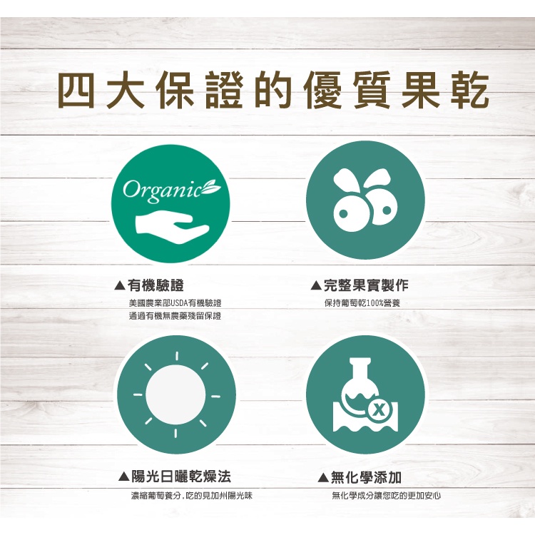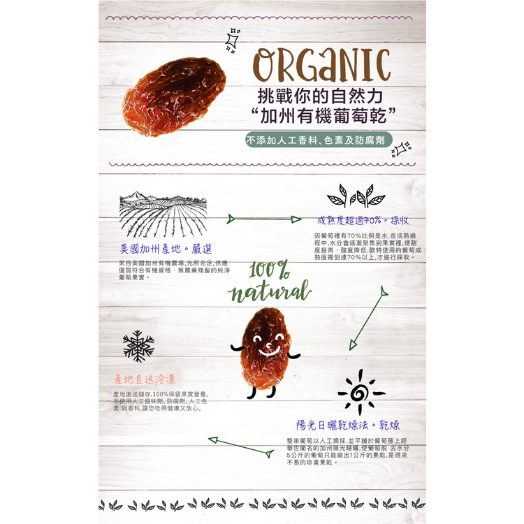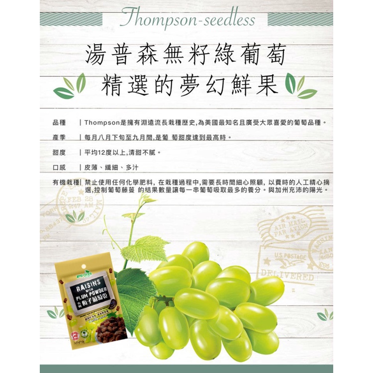 內容物:有機葡萄乾(有機葡萄乾、有機葵花油)(美國、澳洲)、梅子粉(梅子、海鹽、糖粉、甘草粉)(台灣)