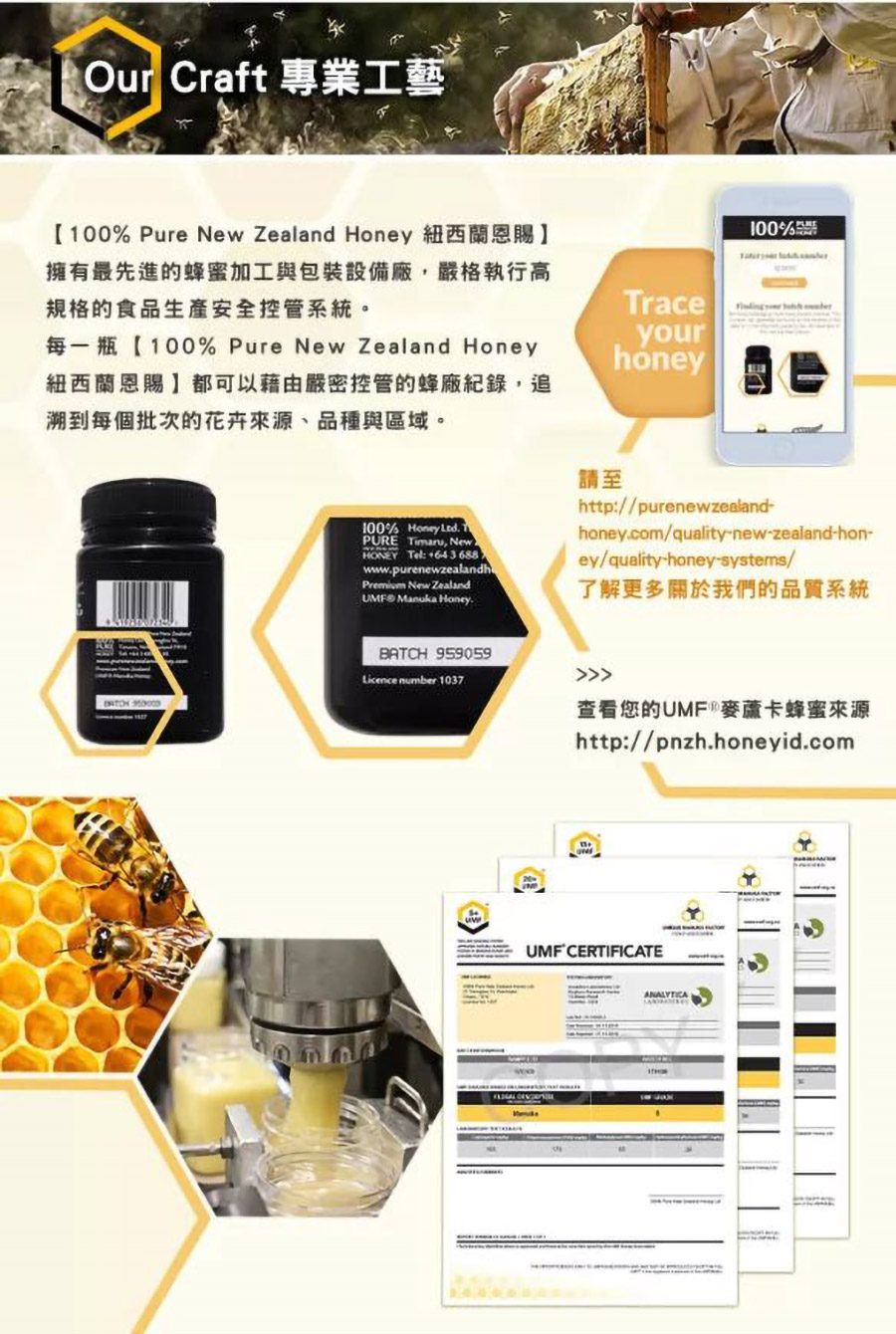 紐西蘭恩賜擁有最先進蜂蜜加工與包裝設備廠,嚴格執行高規格的食品生產安全控管系統,每罐出廠蜂蜜皆有蜂廠紀錄,可追溯每個批次的花卉來源、品種與區域。