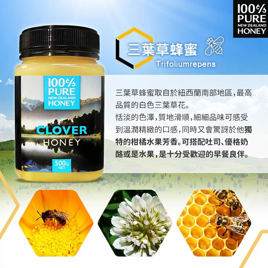 三葉草蜂蜜取自於紐西蘭南部地區,來自最高品質的白色三葉草花,是最純淨無污染的特級蜂蜜。
